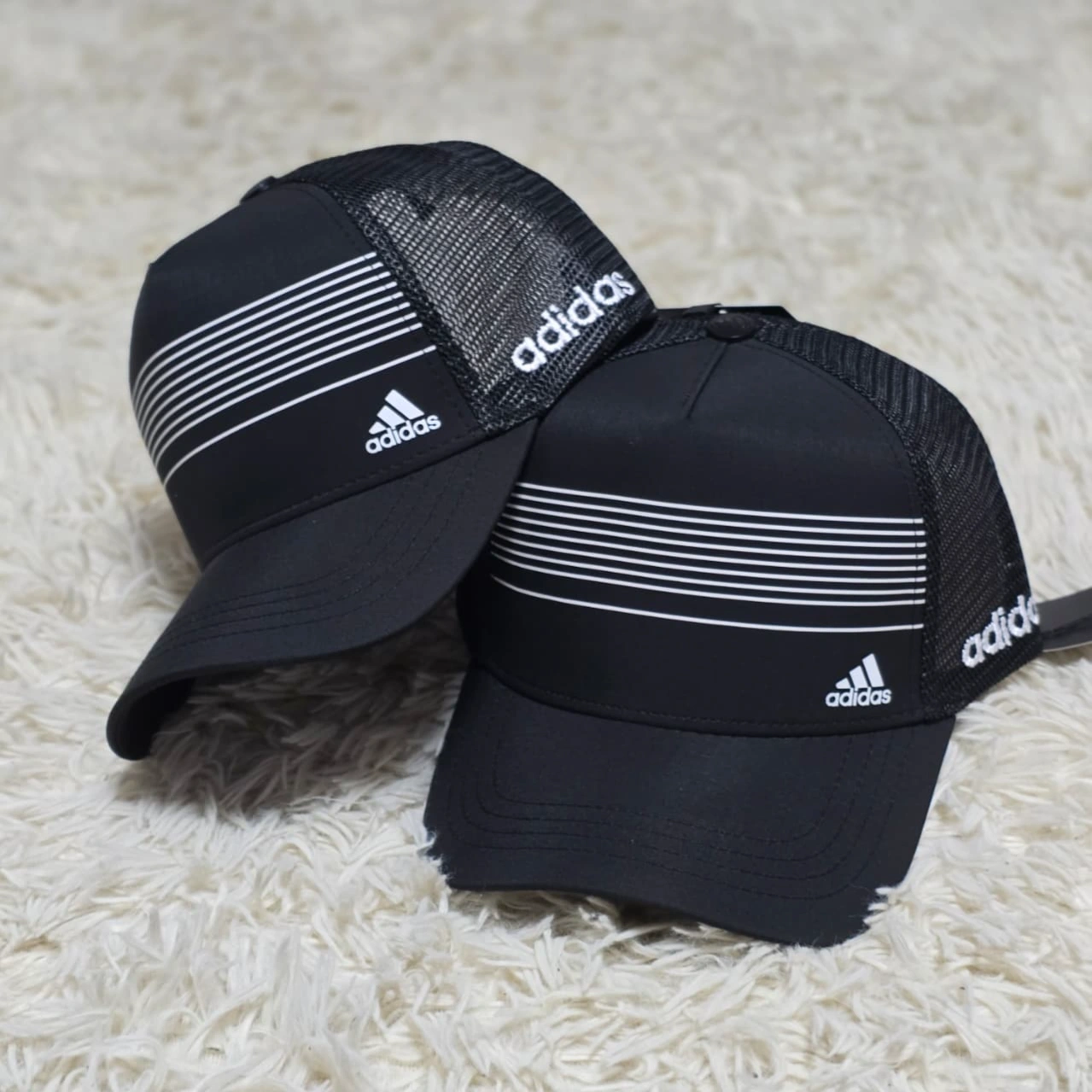 Elevate your casual look with this Adidas cap, blending classic lining print with modern style.