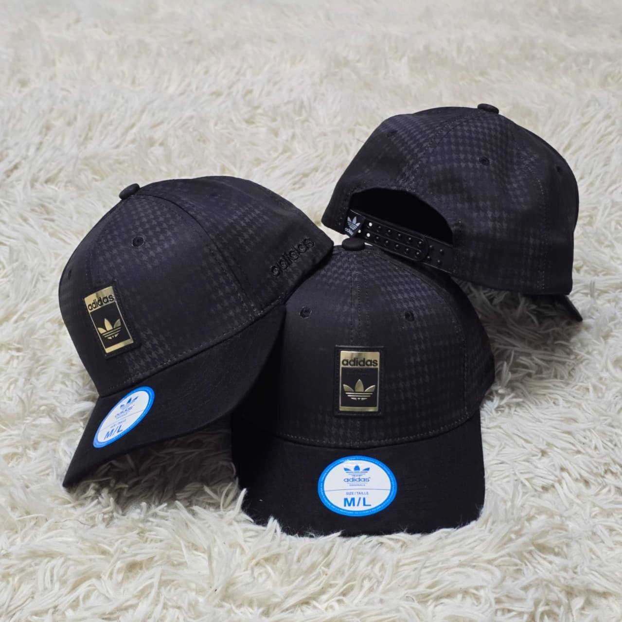 Sizing: The circular blue stickers indicate these are M/L (Medium/Large) sized caps.