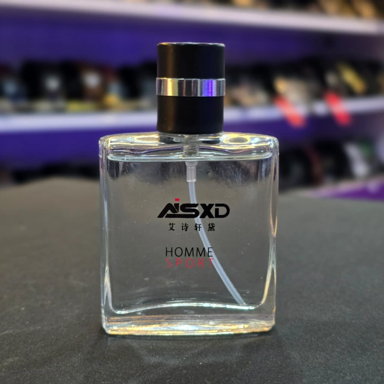 Design: The specific bottle shown features a clear rectangular body with a black cap, labeled as HOMME SPORT.