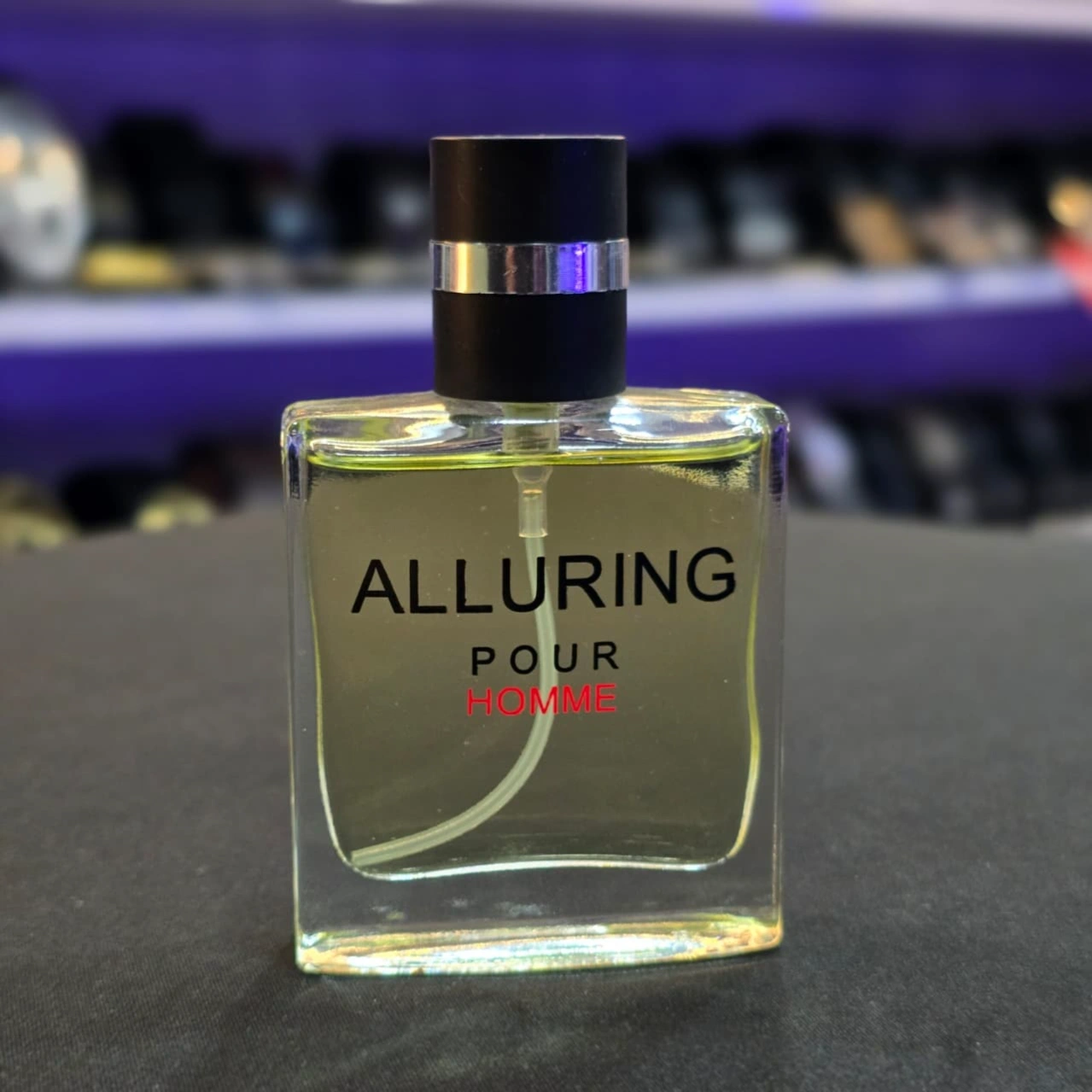 Alluring Pour Homme Eau De Parfum, a masculine fragrance designed to project a sophisticated and confident aura. This perfume is typically presented as an affordable alternative or "inspired by" the classic scent profile of Chanel Allure Homme Sport.