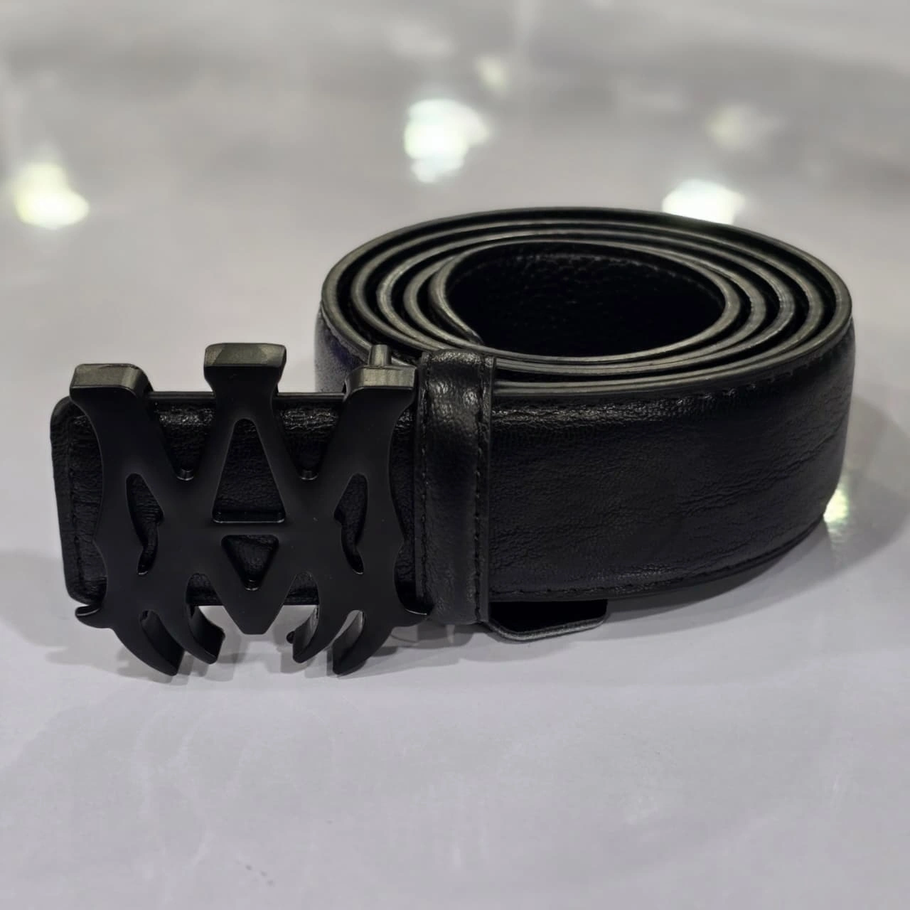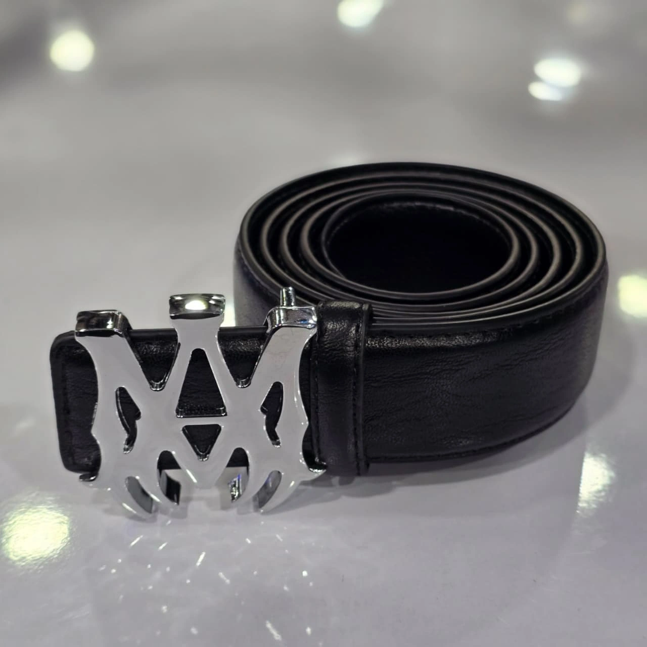 AMIRI M.A. Monogram Leather Belt, a signature accessory from the American luxury fashion house. It features a prominent monogram buckle inspired by the initials of the brand's founder, Mike Amiri.