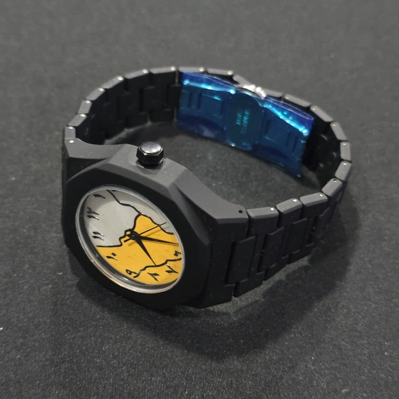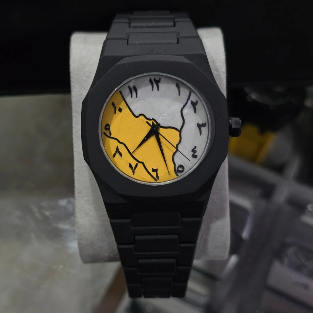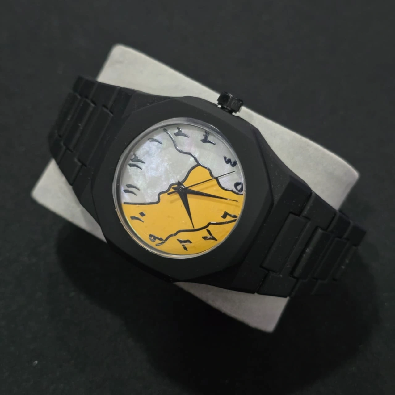 Design: It features a matte-black octagonal case and matching bracelet, giving it a modern and sleek look. The dial has a unique "split" aesthetic, in this case, yellow and white, with prominent Arabic hour markers.