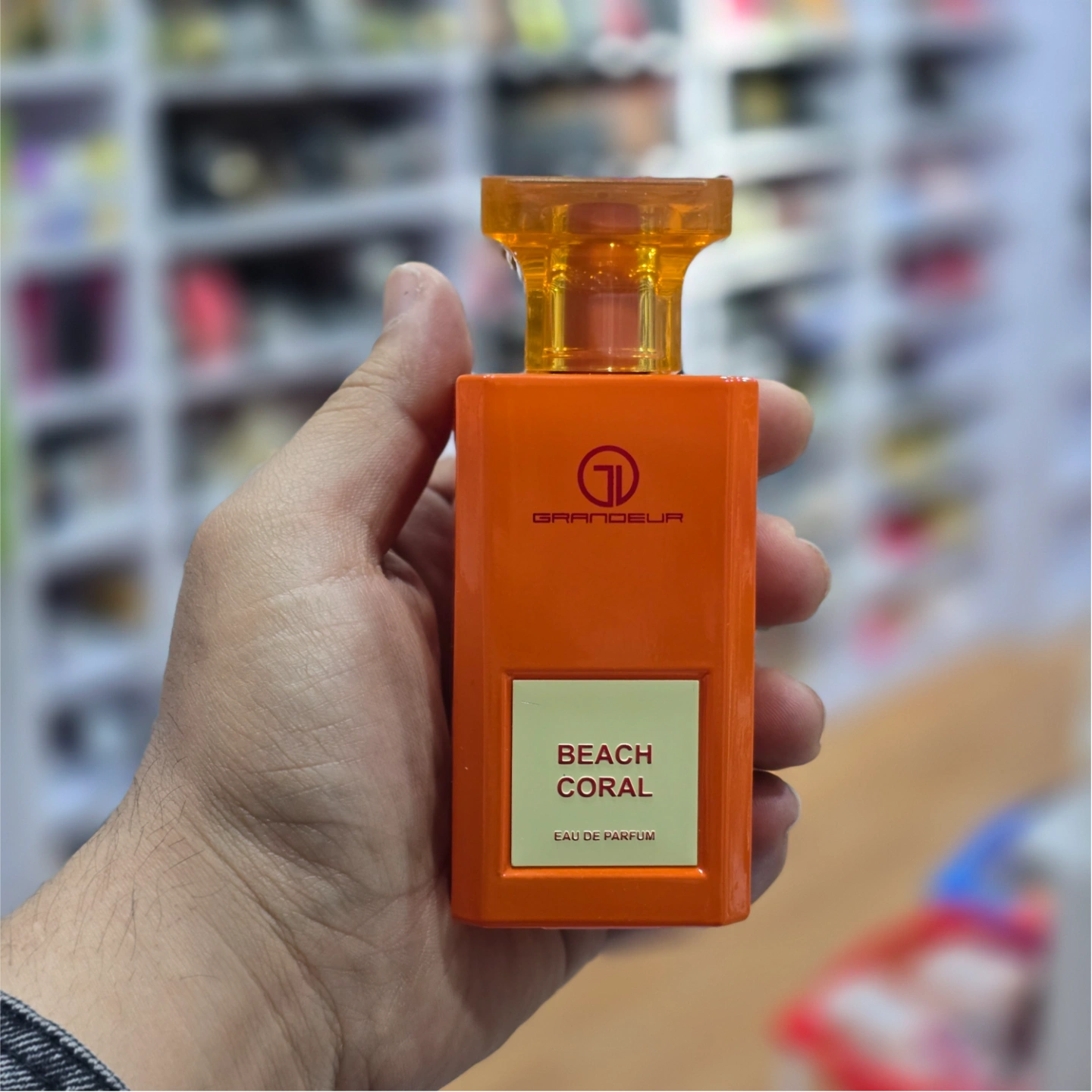 Beach Coral Eau De Parfum by Grandeur (part of Al Wataniah). It is a unisex fragrance often described as a luxurious, tropical scent inspired by Tom Ford's Bitter Peach.