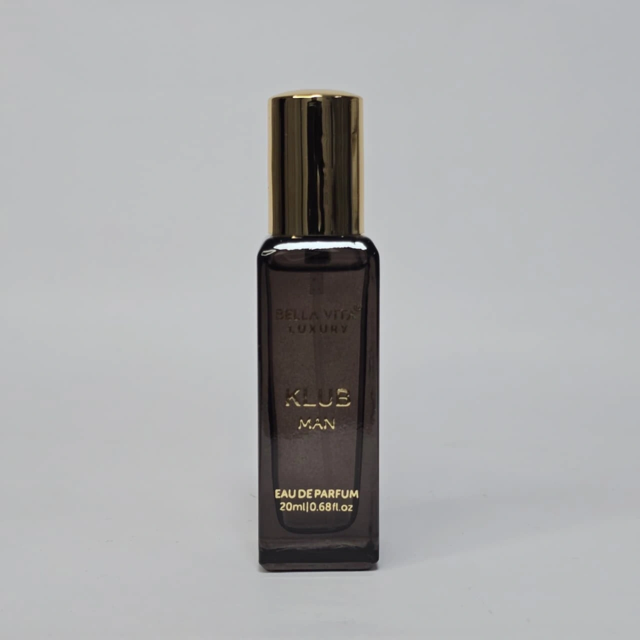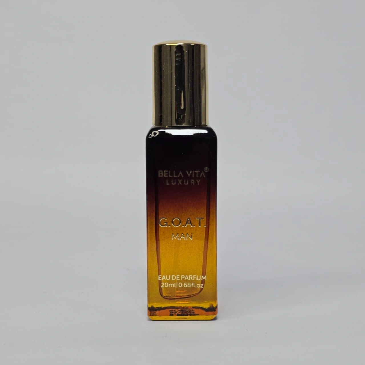 Bella Vita Luxury G.O.A.T. Man, a bold and sophisticated Eau De Parfum (EDP). The bottle shown is a compact 20ml (0.68 fl oz) travel-size version, often included in luxury miniature gift sets.