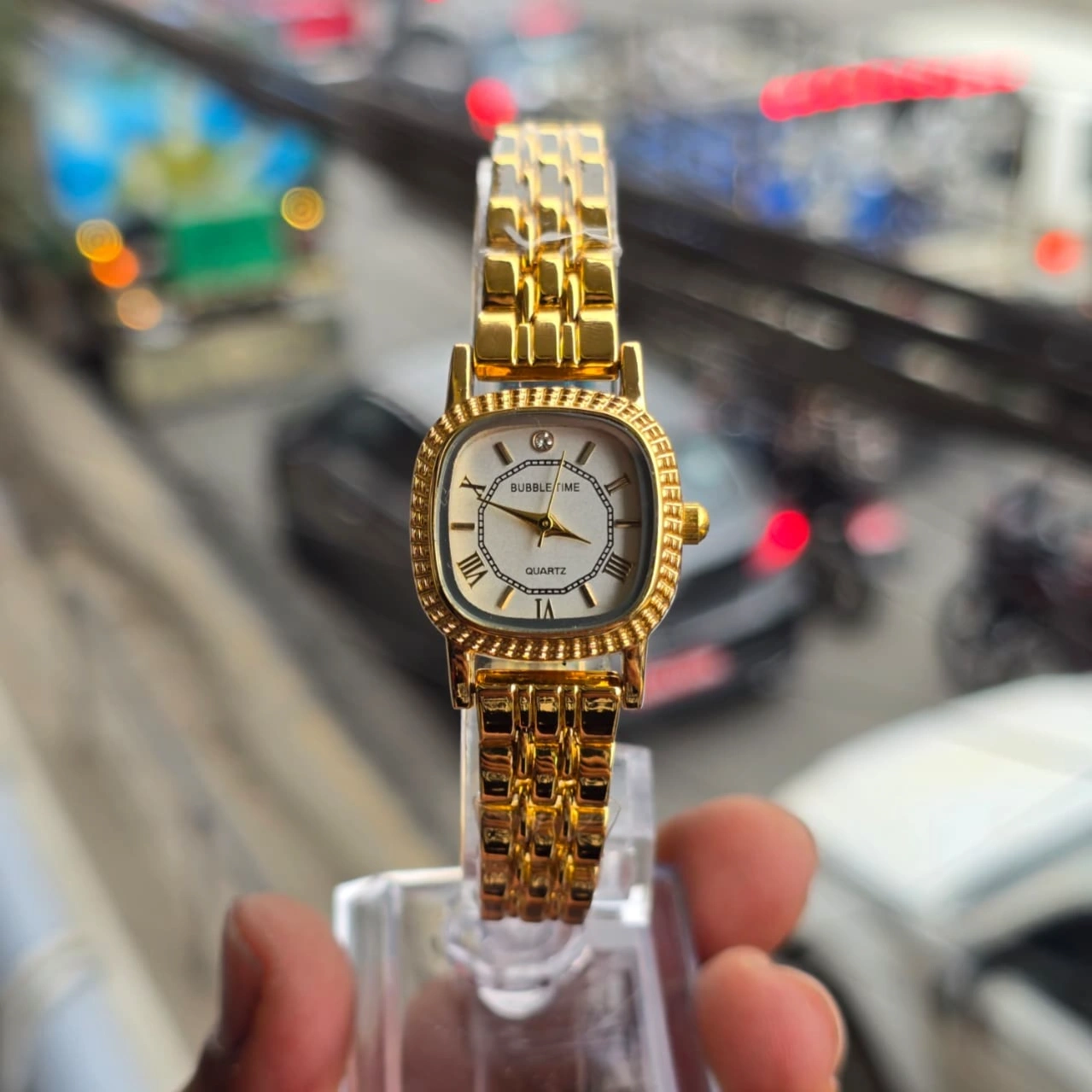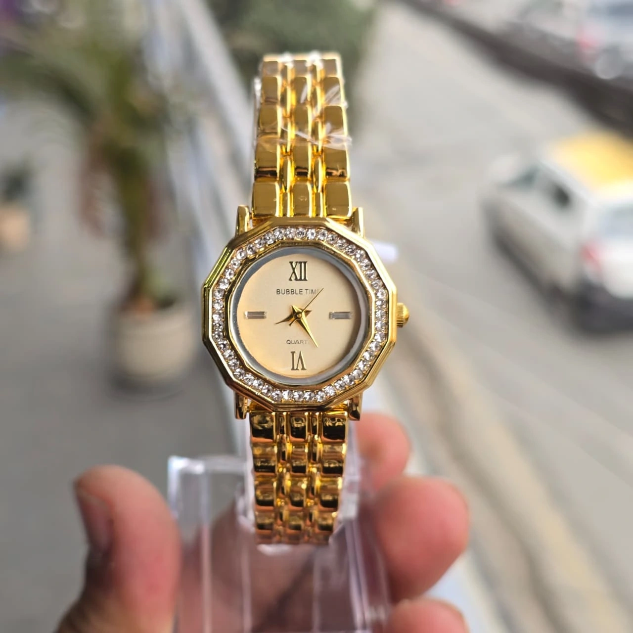 Bubble Time Quartz Ladies Watch, an elegant timepiece designed as a fashionable accessory for modern women. It features a unique "bubble-inspired" design on its dial and is powered by a reliable quartz movement.