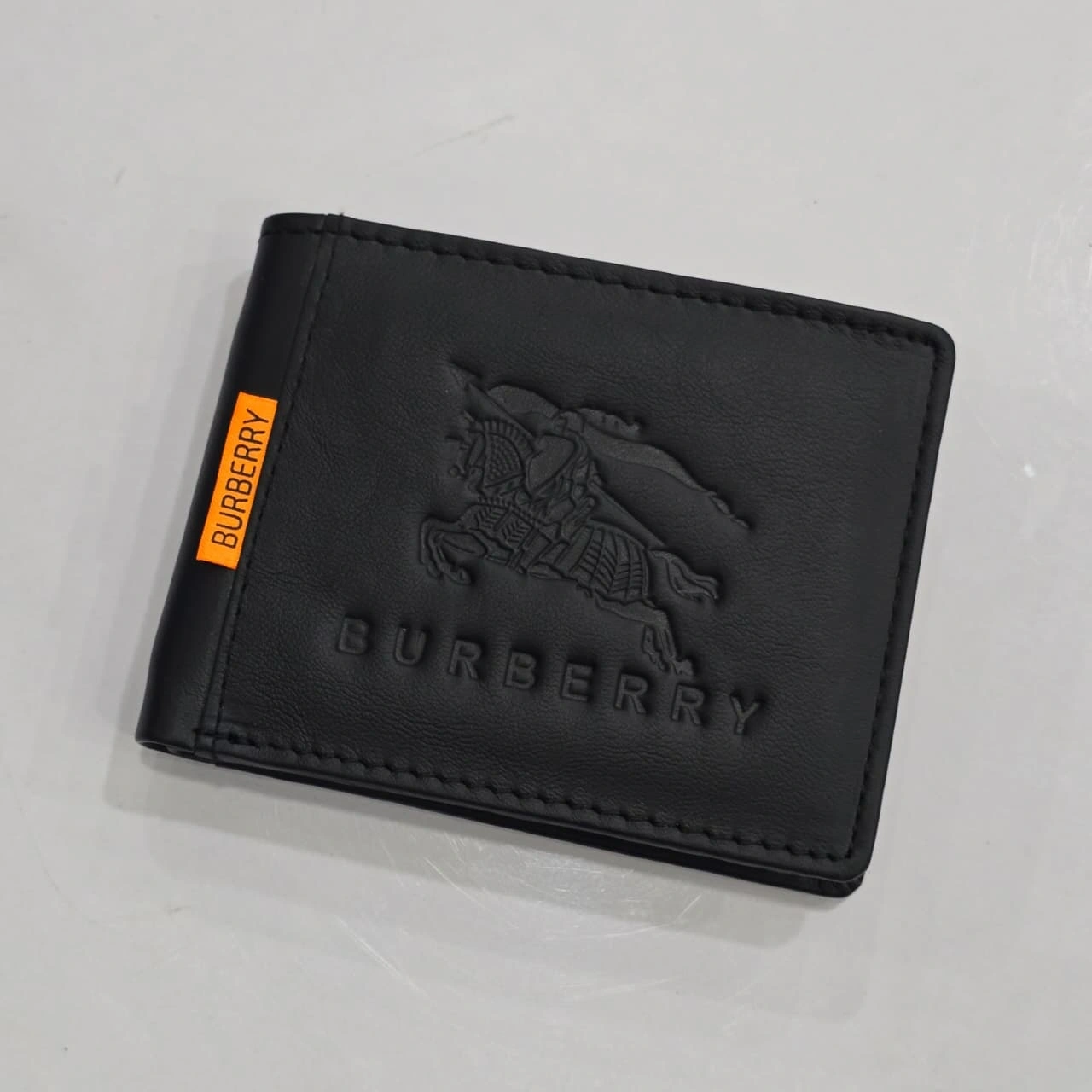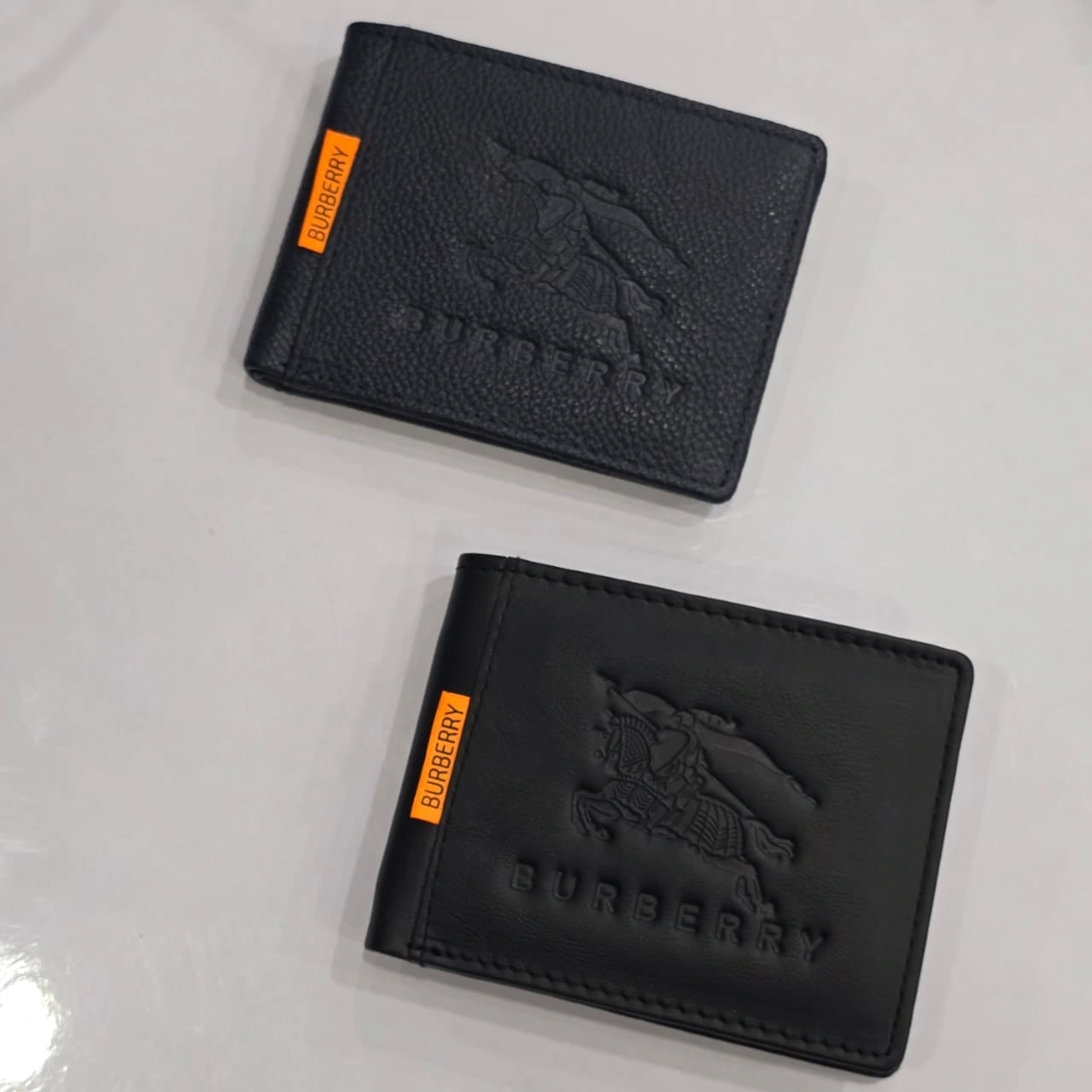 Burberry-branded bifold leather wallets featuring the classic embossed Equestrian Knight Design (EKD) logo and a distinctive orange side tag. These wallets are frequently sold in South Asian markets like Nepal and Pakistan as premium leather accessories.