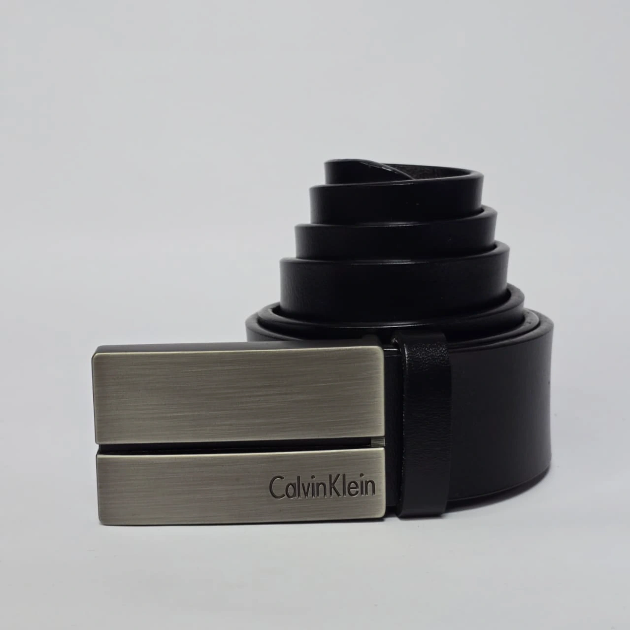 Calvin Klein formal plaque belt, a sleek and minimalist accessory designed for both office and everyday wear. It features a smooth black leather strap paired with a rectangular, brushed gunmetal-toned metal buckle that is prominently engraved with the "Calvin Klein" brand name.