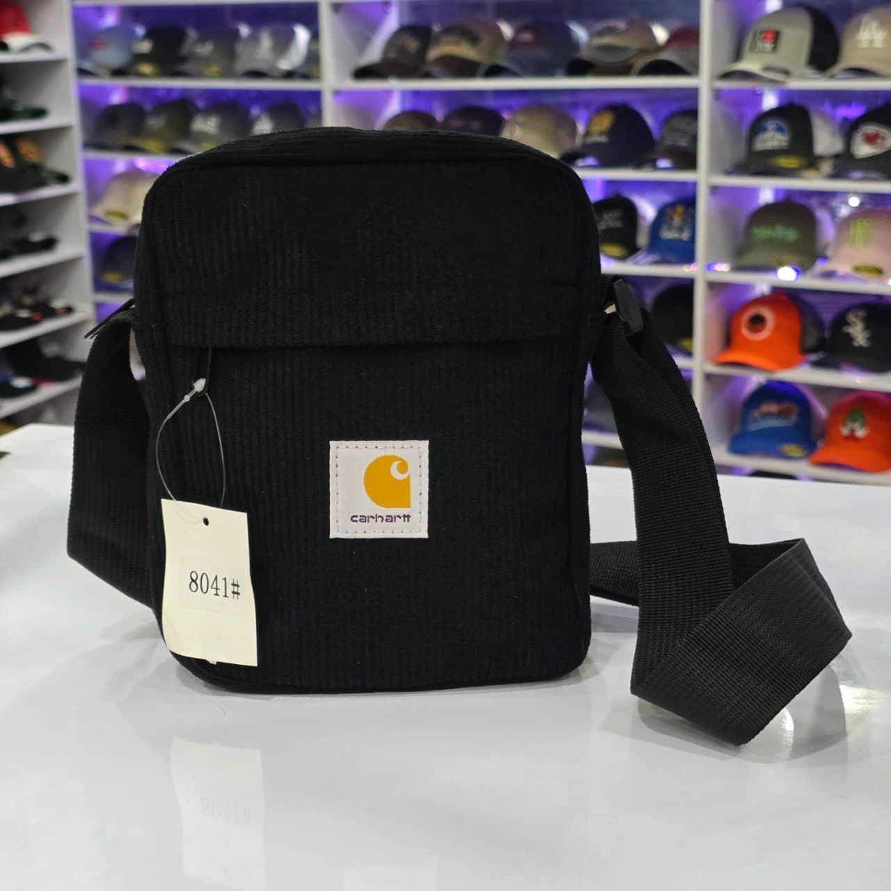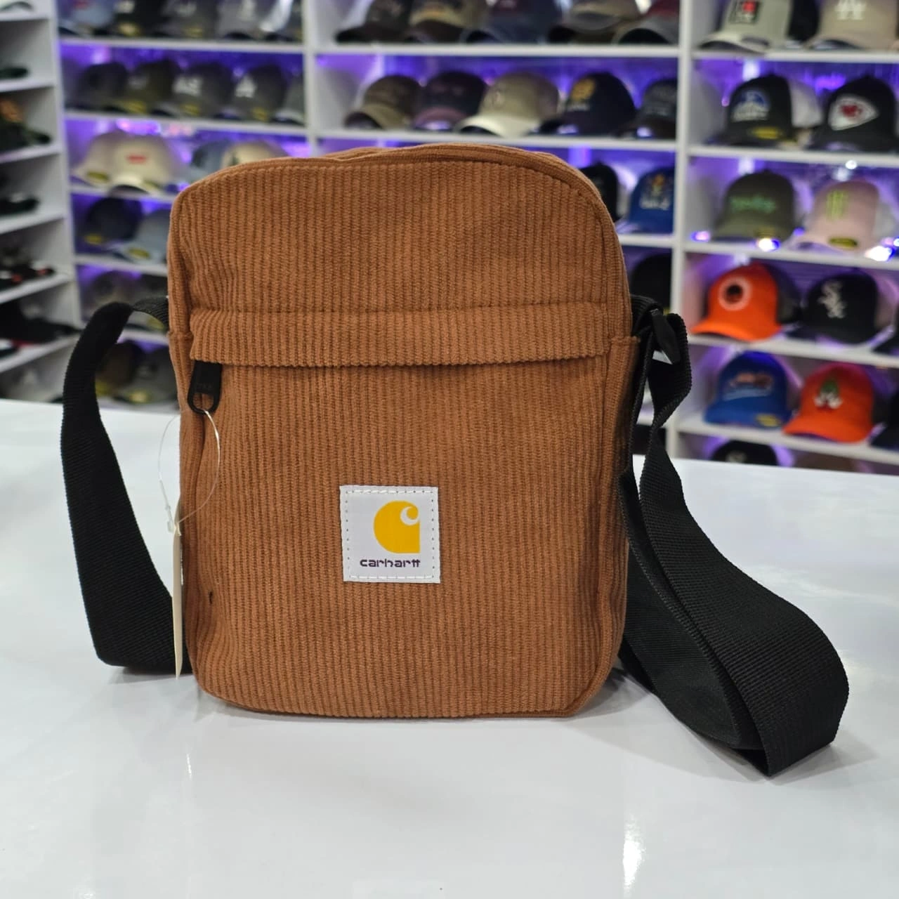 Design: The bag features a main zippered compartment, a smaller zippered front pocket, and an interior zippered pocket. It is finished with the classic Carhartt WIP woven Square Label on the front.
