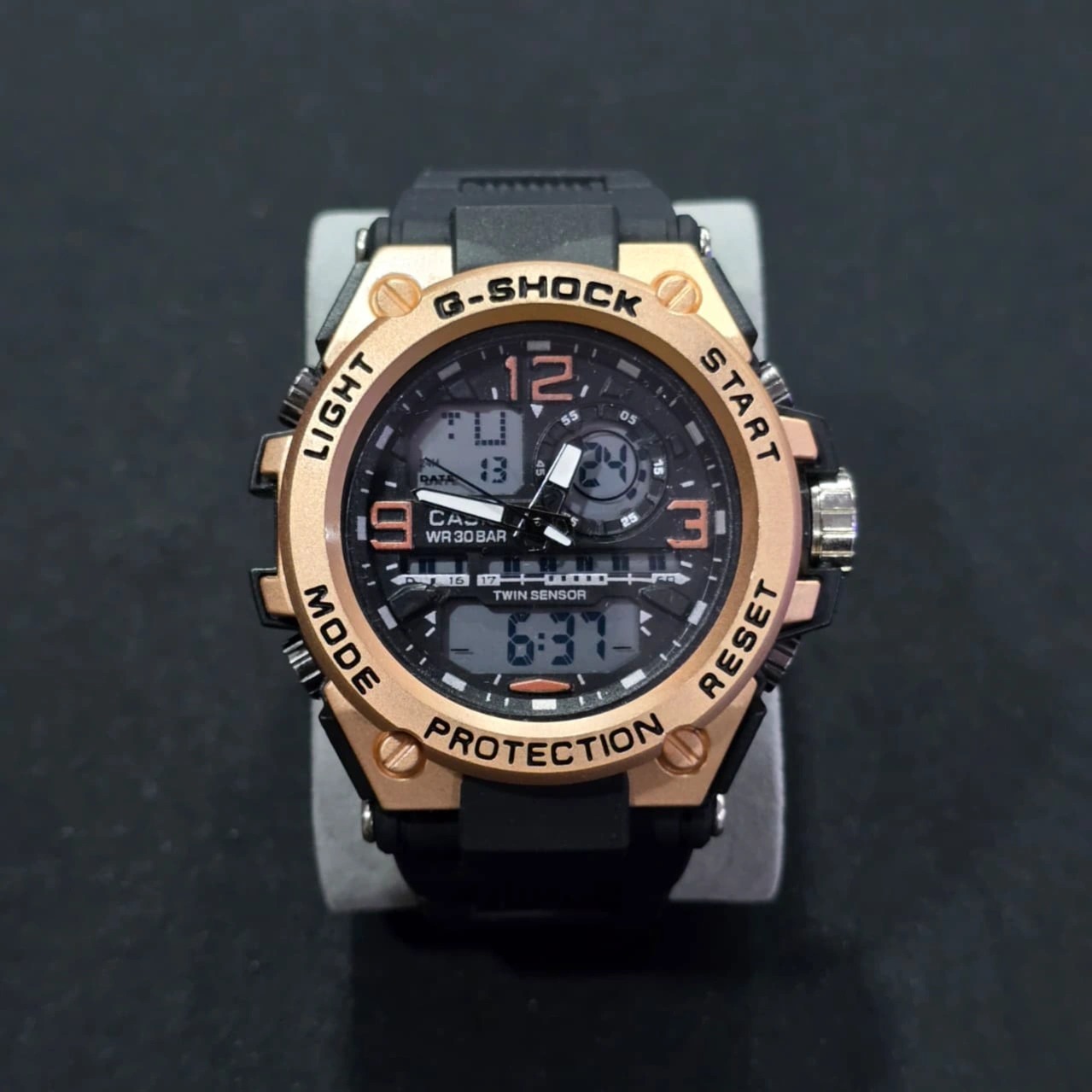 Casio G-Shock 5478_GG1000, a high-performance analog-digital timepiece designed for durability and outdoor functionality. This specific variant features a prominent rose gold metallic bezel paired with a black resin case and strap.