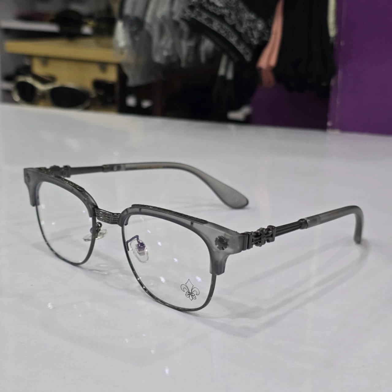 Design & Style: These glasses feature a classic "Clubmaster" silhouette with a thick black acetate top bar and a slim silver-toned metal lower rim [3].
