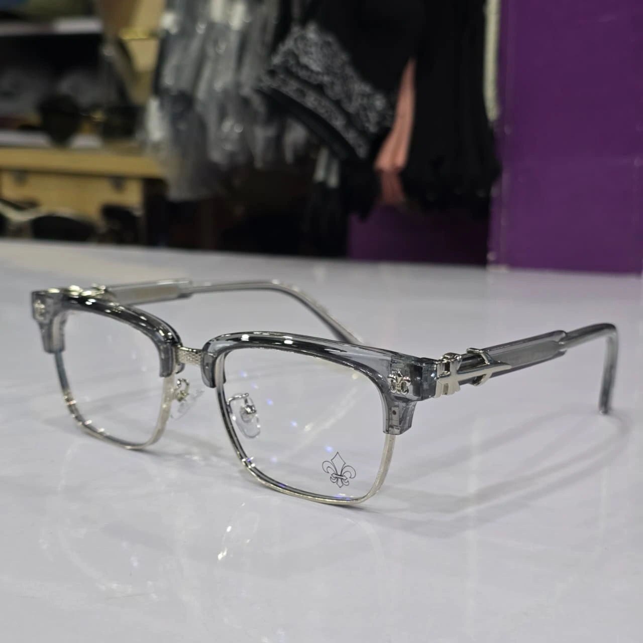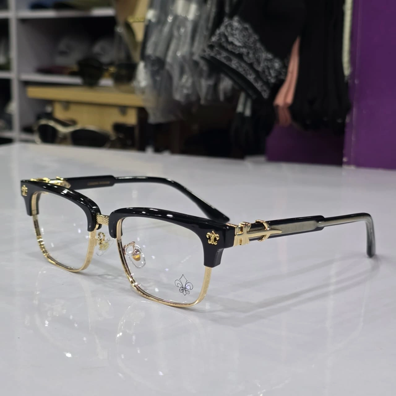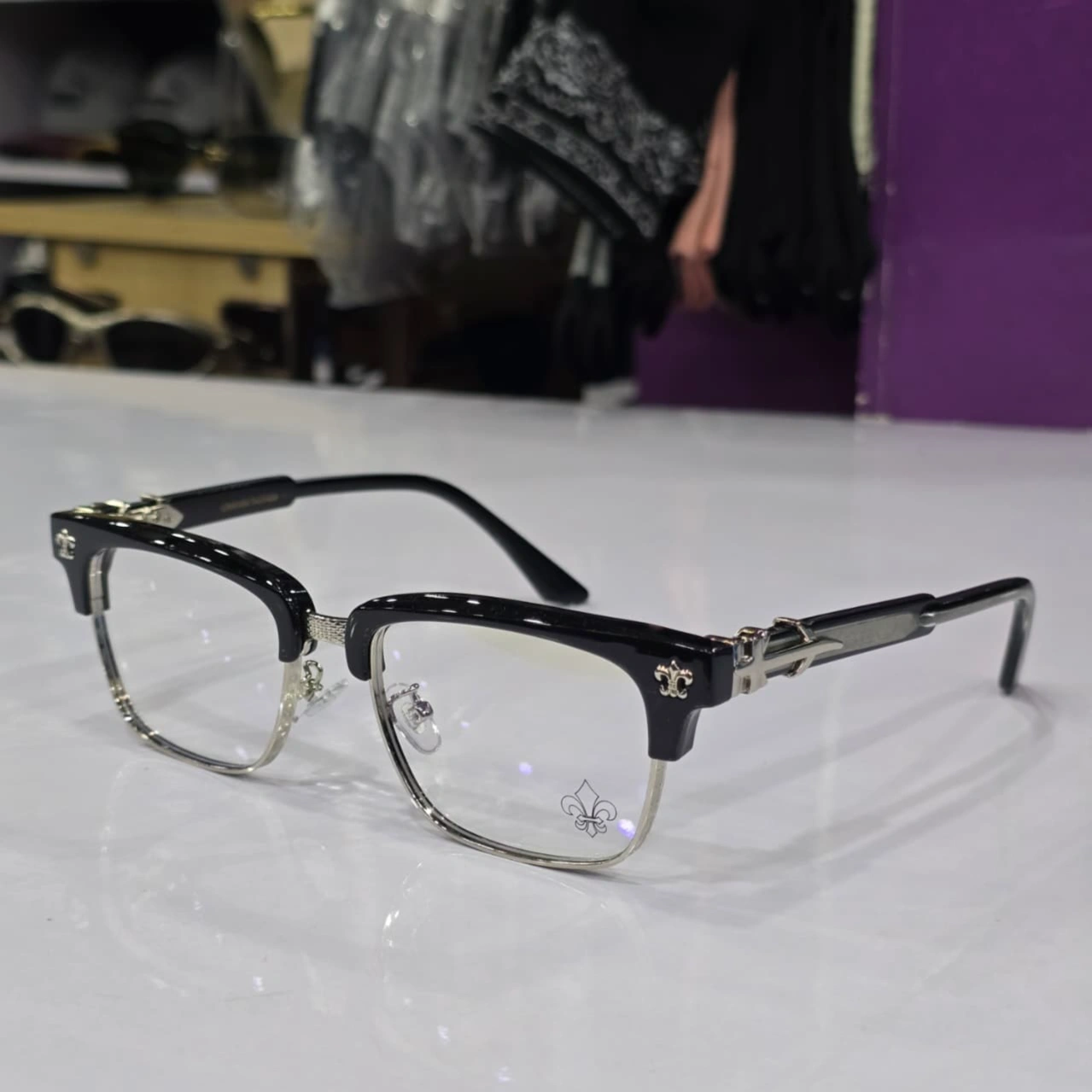 Chrome Hearts browline-style glasses, a luxury eyewear model known for its bold design and signature sterling silver gothic embellishments [3, 9]. This specific style features a classic "Clubmaster" silhouette enhanced with high-end, intricate detailing [4].