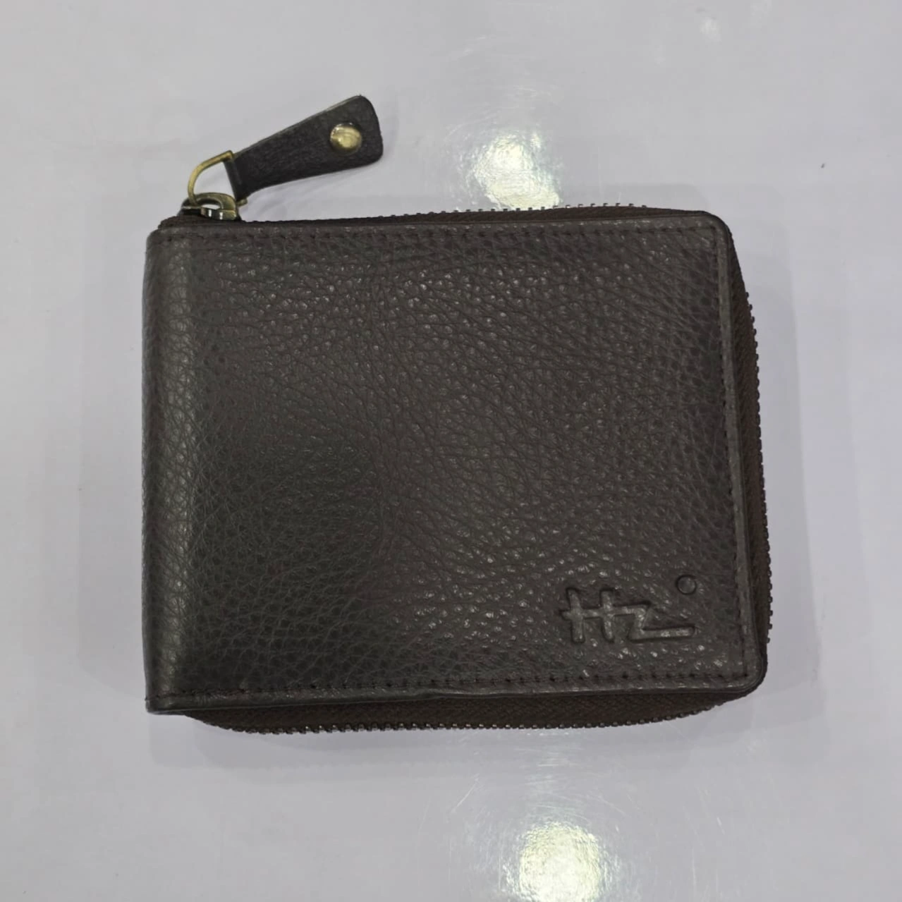 Dark brown bifold zip-around wallet by the brand HZ. It is crafted from genuine leather and features a distinctive textured, pebbled finish.