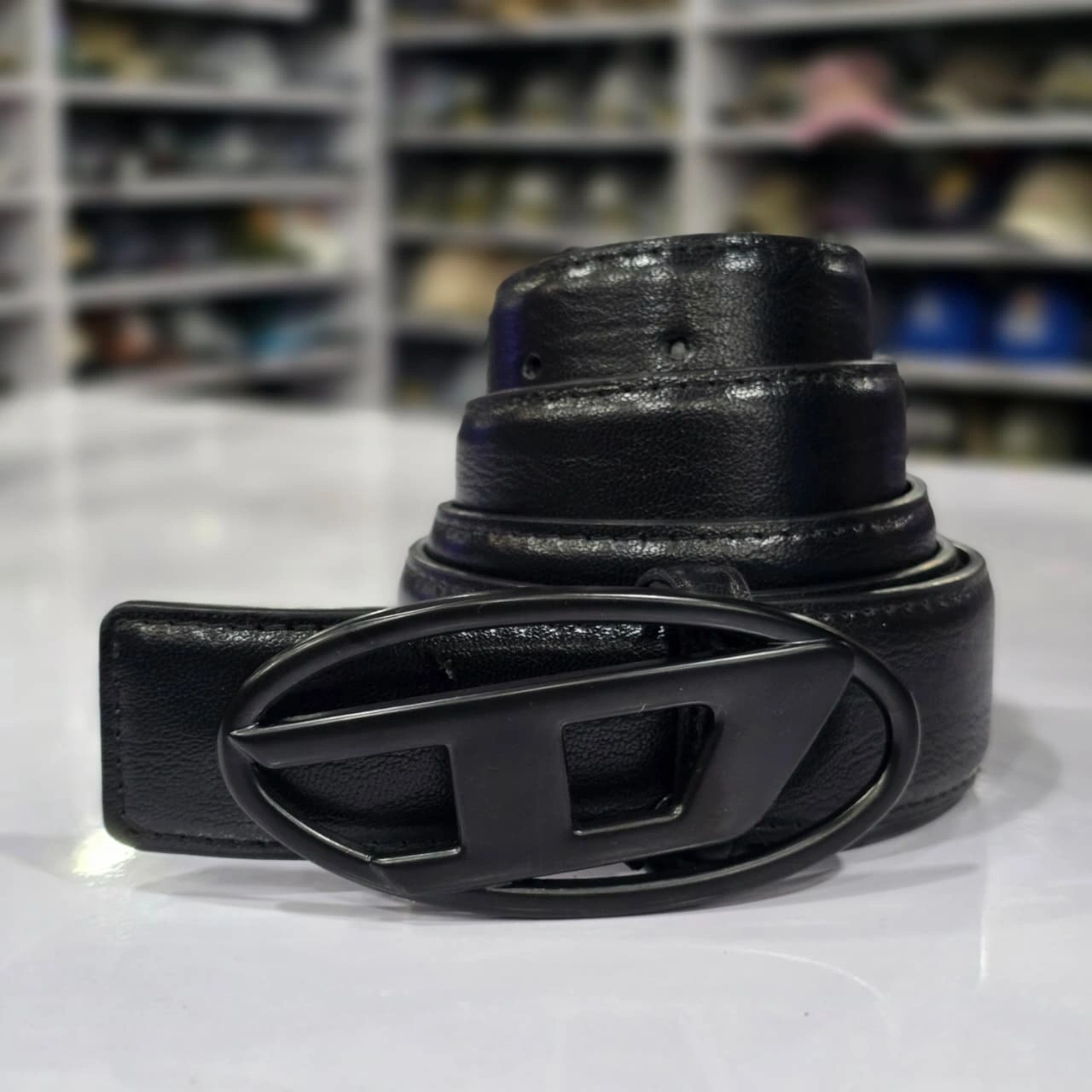 Diesel B-1DR Leather Belt, a highly recognizable accessory from the Italian fashion brand. It is characterized by its large, metallic "Oval D" logo buckle, which has become a hallmark of the brand's contemporary aesthetic.