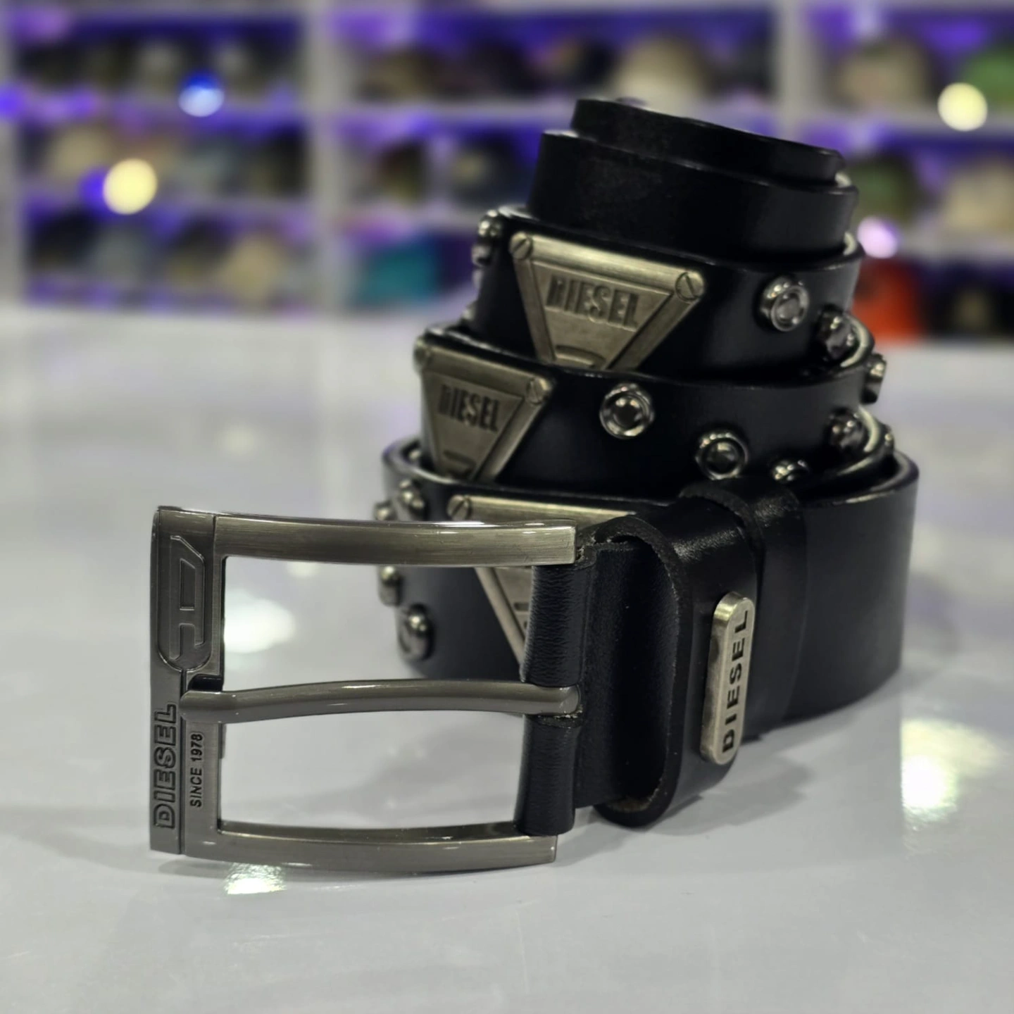 Hardware: It features a sturdy metallic pin buckle with "DIESEL SINCE 1978" and the "D" logo engraved on the frame.