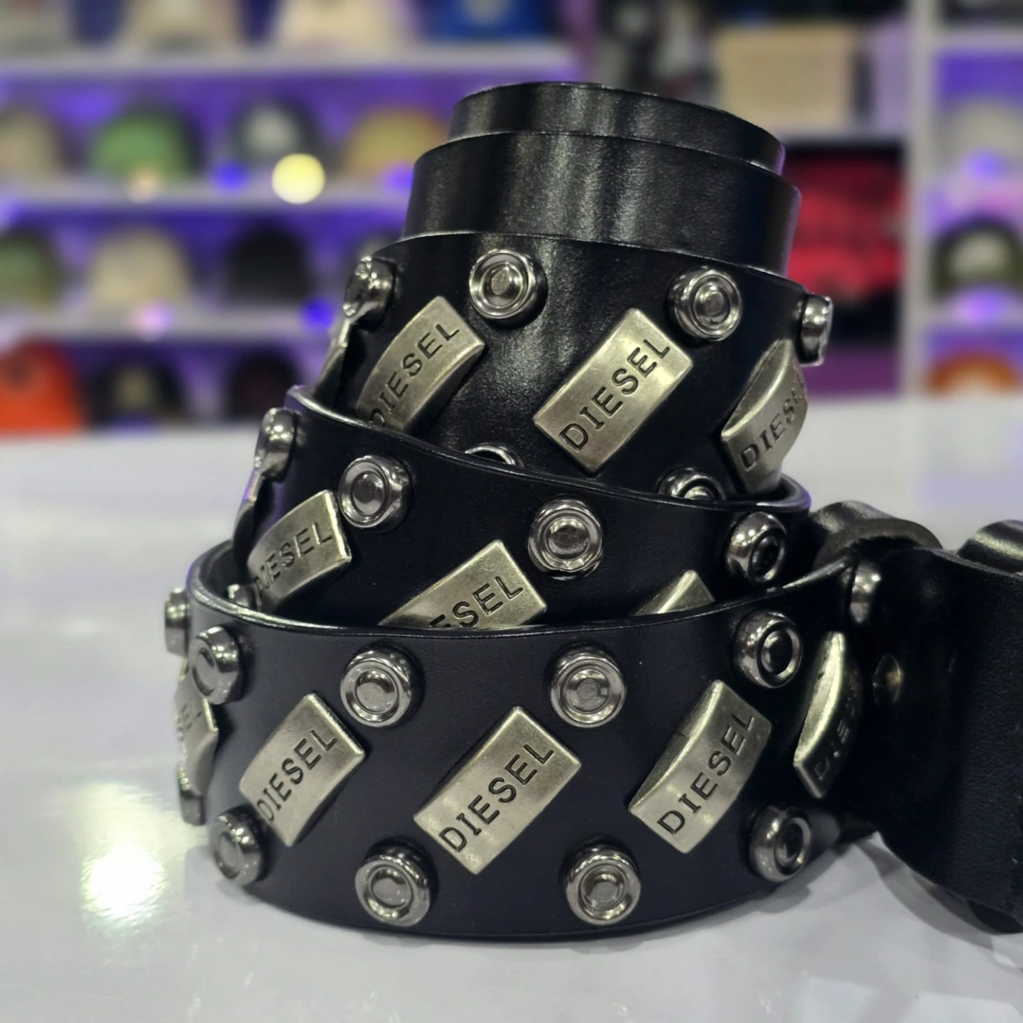 Diesel Studded Leather Belt, a punk-rock-inspired accessory known for its heavy metal detailing and distressed aesthetic. It is often listed in online marketplaces under names like the "Ribbit" or "Nuckle" leather belt.