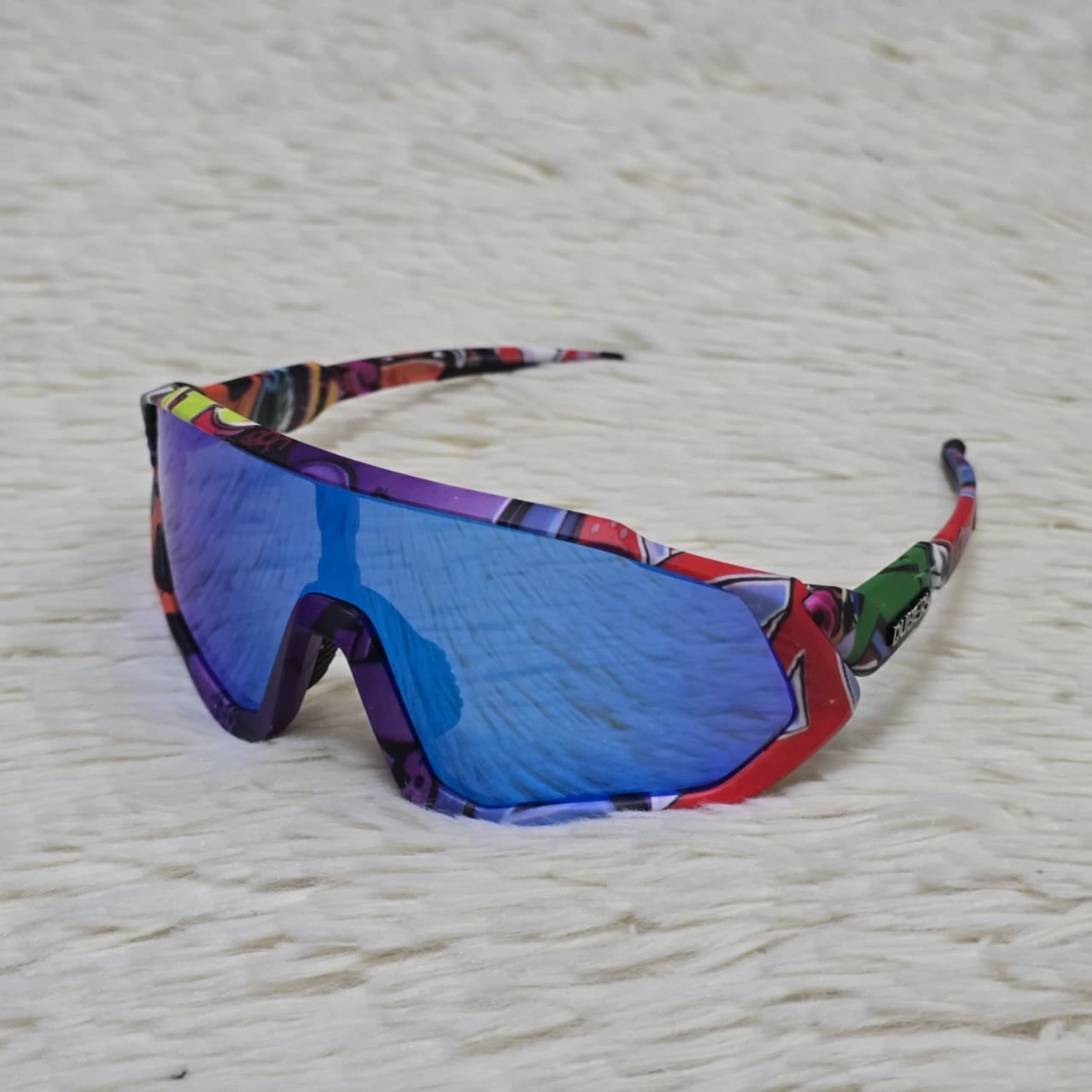 Frame: Lightweight and durable unisex wraparound frame featuring a "water transfer" graffiti print in red, purple, and blue tones.