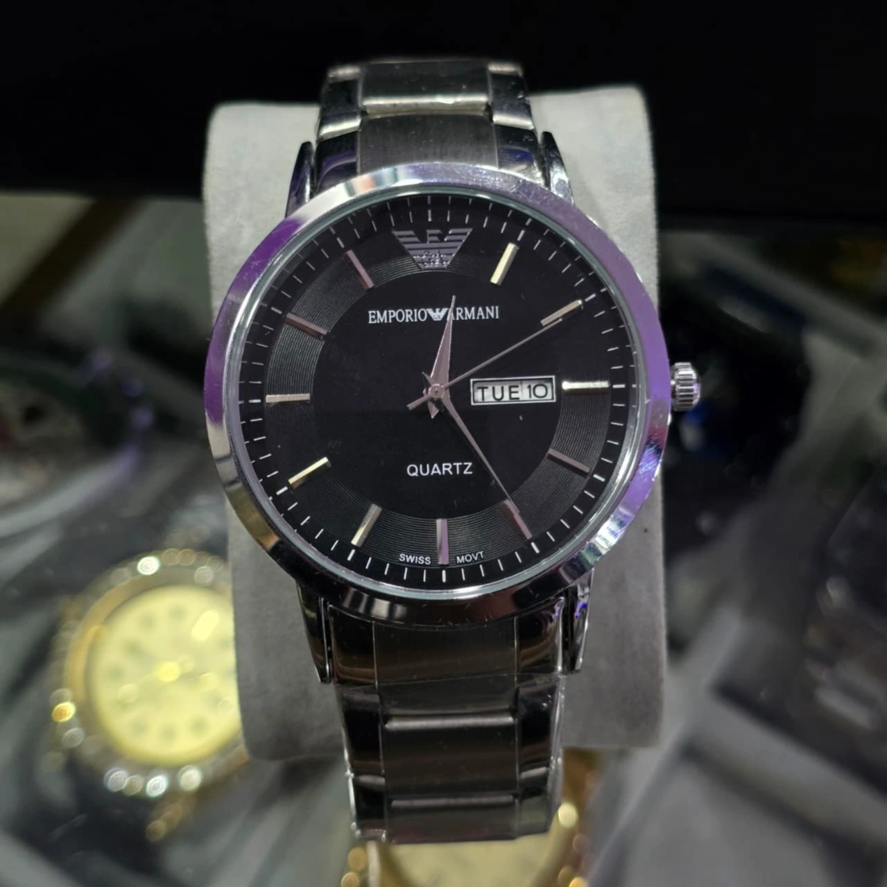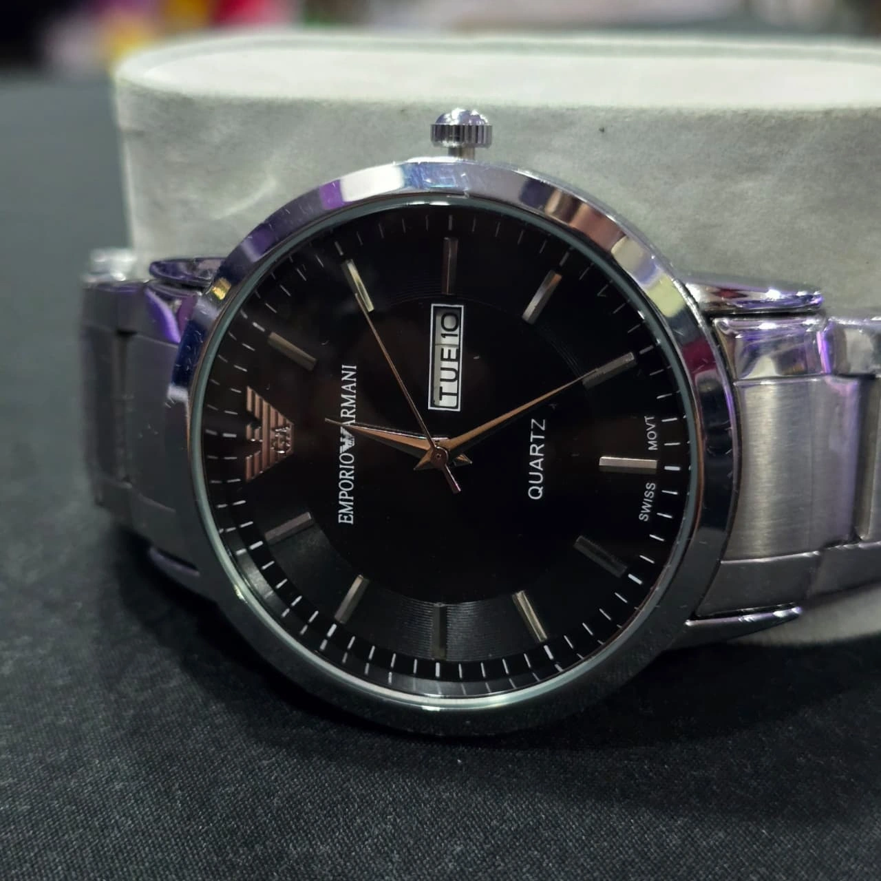 Emporio Armani Classic Day-Date wristwatch, featuring a polished stainless steel design with a functional calendar display.