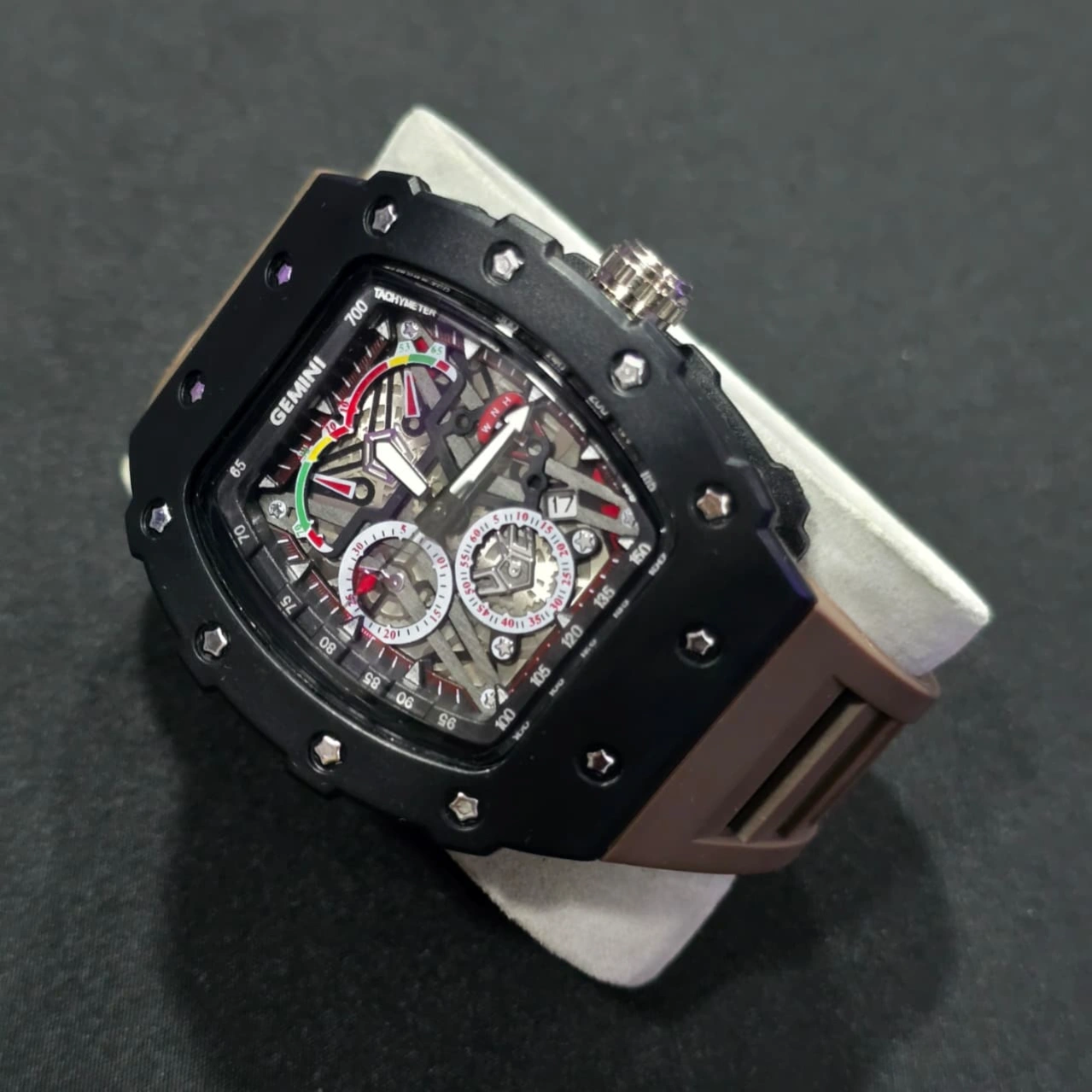 Gemini Skeleton Chronograph. It is a men's sports watch with a "Richard Mille-inspired" design. It has a barrel-shaped case and an open-heart dial.