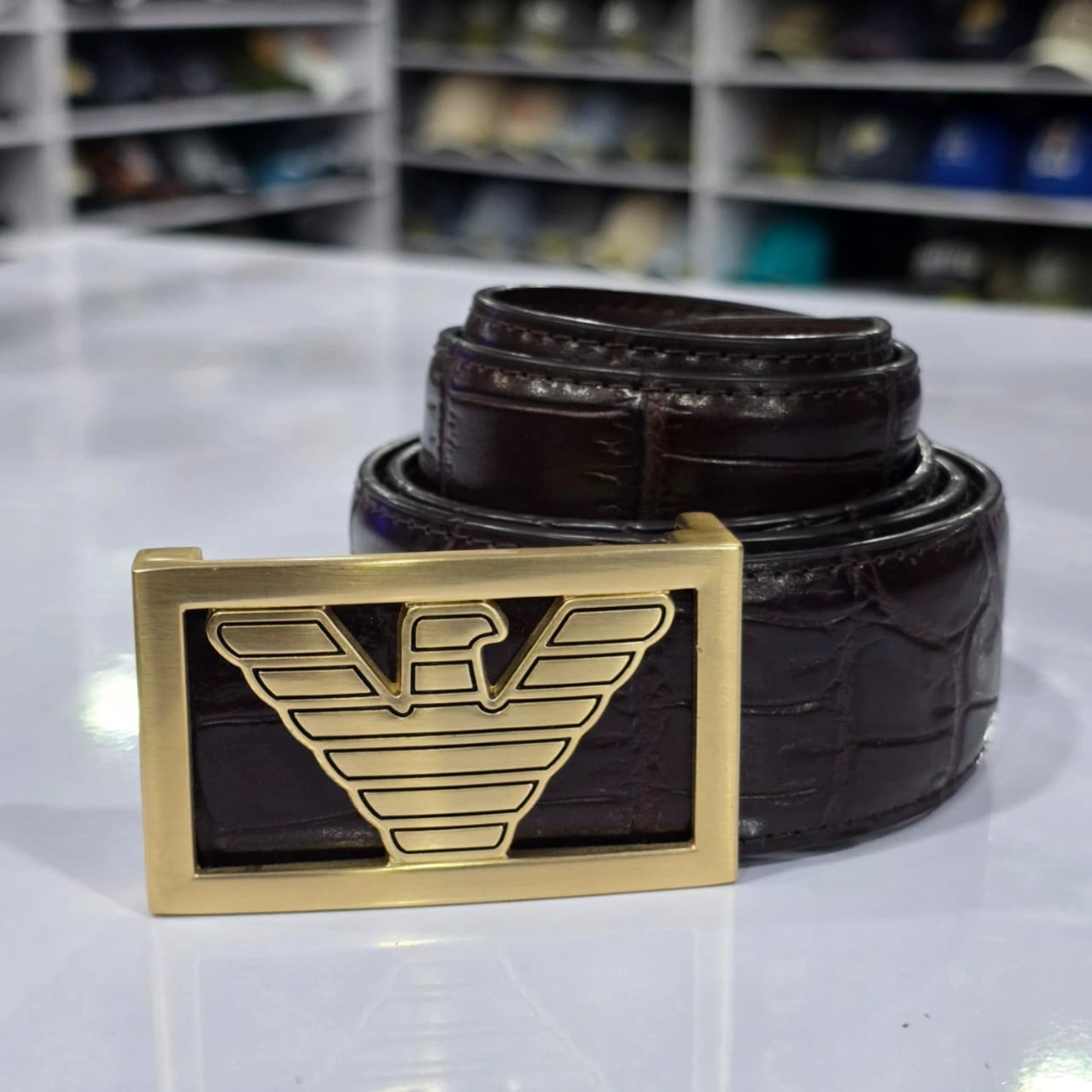 Iconic Buckle: The defining feature is the rectangular gold-tone buckle showcasing the signature Giorgio Armani eagle emblem.