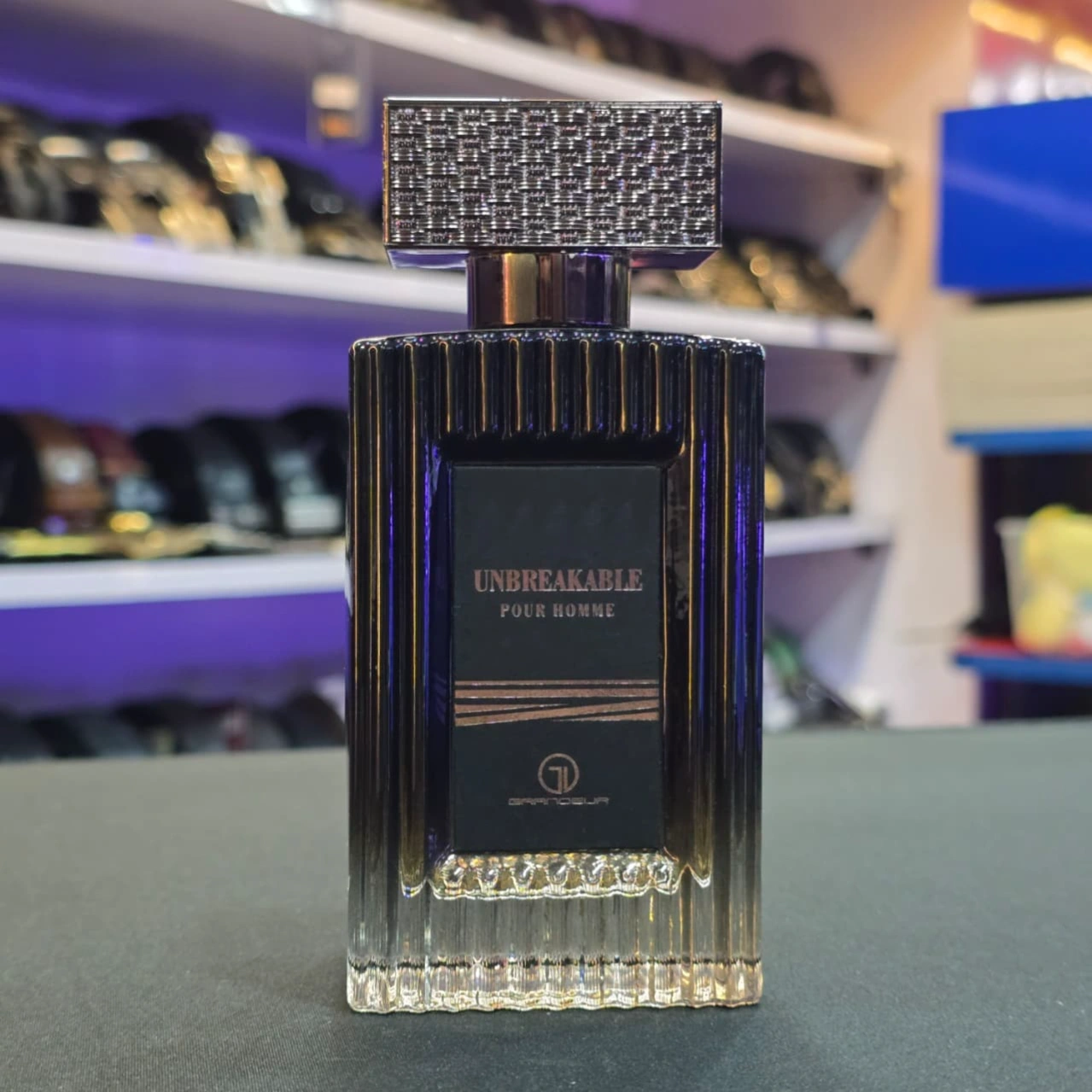 Grandeur Elite Unbreakable Pour Homme, a 100ml Eau de Parfum (EDP) designed for men. It is a versatile fragrance from the United Arab Emirates (UAE) characterized by a blend of fruity, floral, and woody notes.
