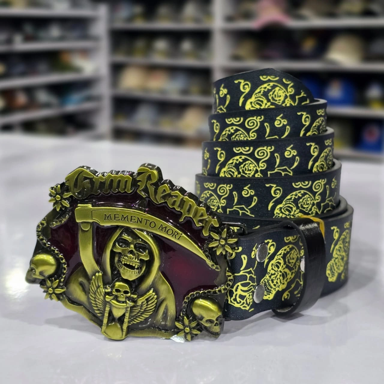 Iconic Buckle: The centerpiece is an ornate, multi-color plate-style buckle featuring a Grim Reaper figure holding a scythe. It prominently displays the Latin phrase "MEMENTO MORI" (Remember you must die).