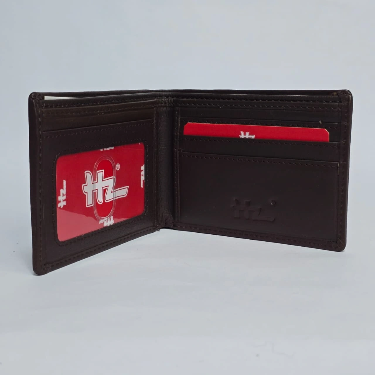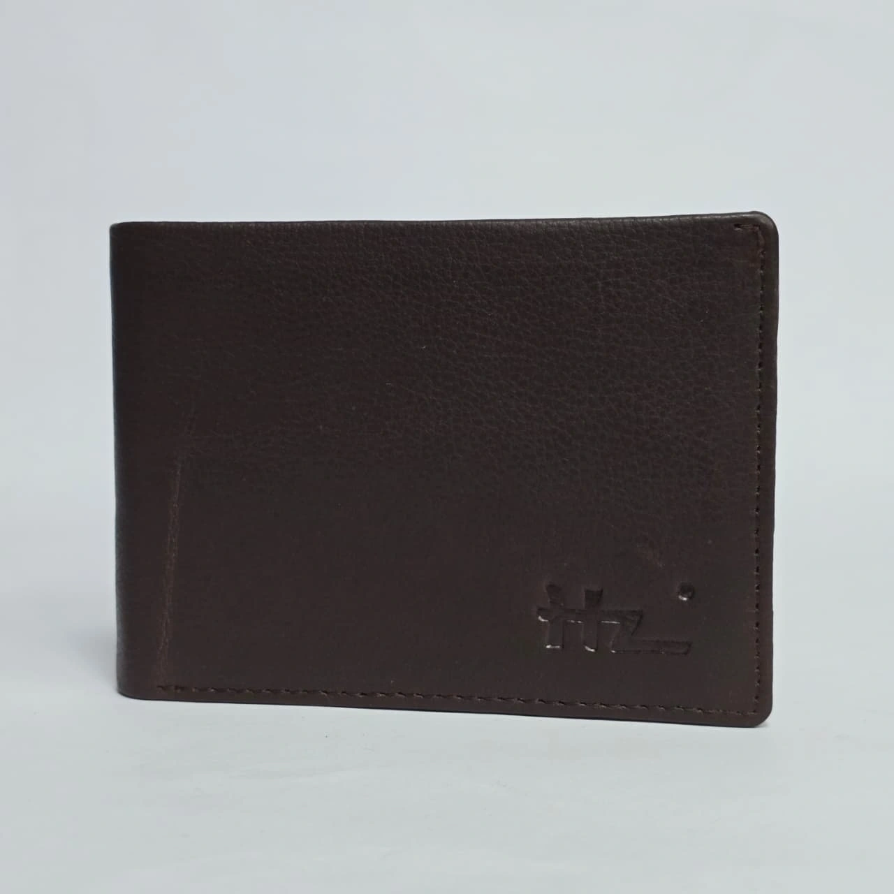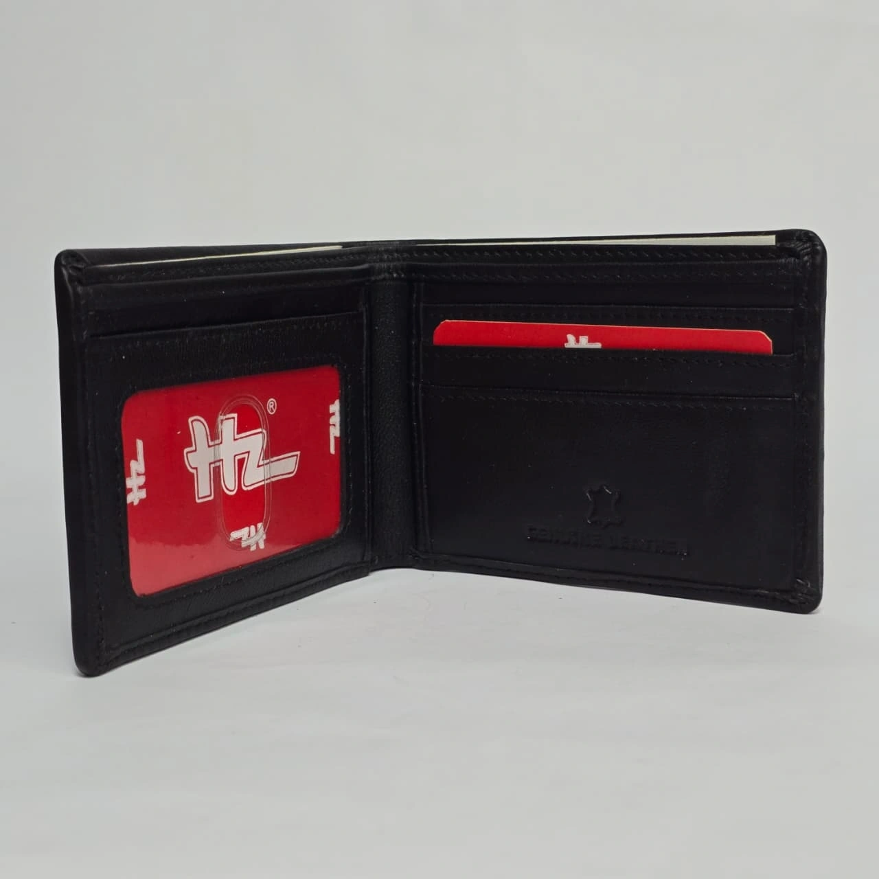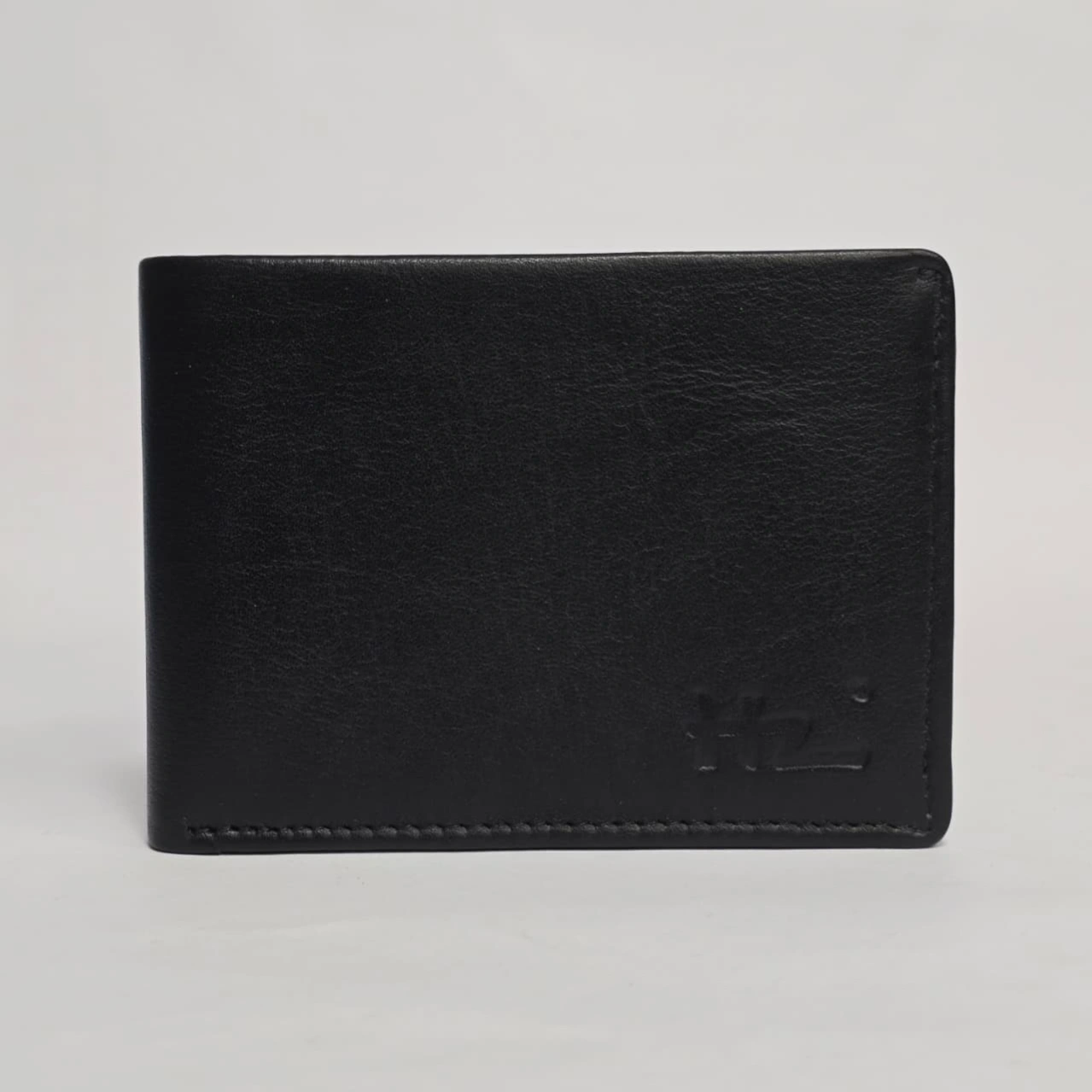 HZ Premium Genuine Leather Bi-Fold Wallet in black. It is a sleek, professional accessory characterized by its smooth texture and a distinct embossed "HZ" logo on the bottom right corner