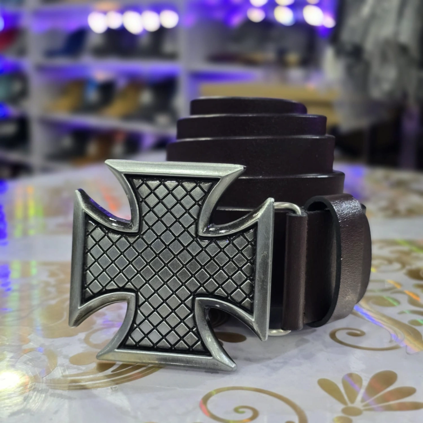 Iron Cross Belt Buckle, a bold accessory frequently associated with biker, gothic, and alternative fashion styles.