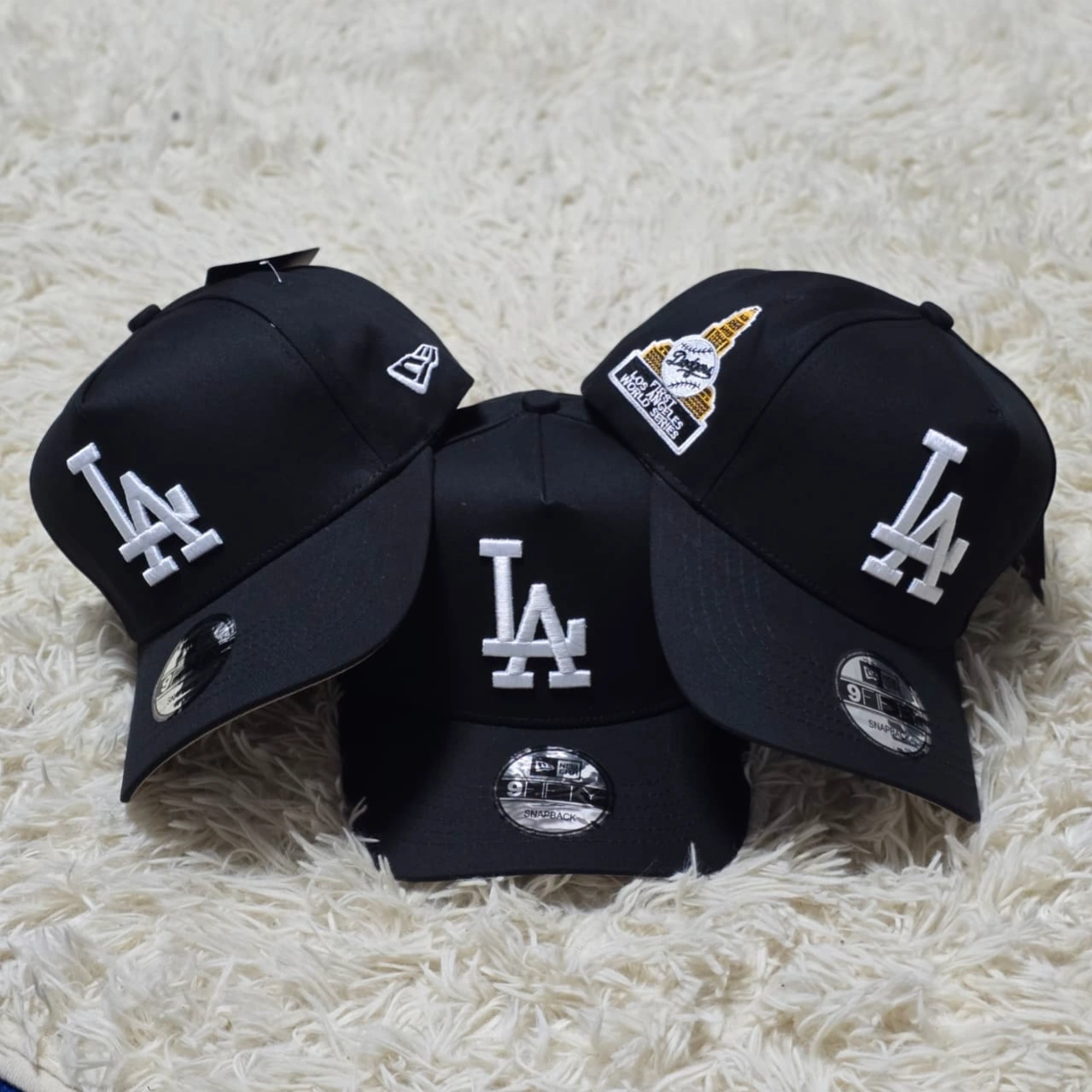 Los Angeles Dodgers World Series Commemorative Snapback Caps in black [5]. These hats celebrate the team's championship history with a classic, structured look.