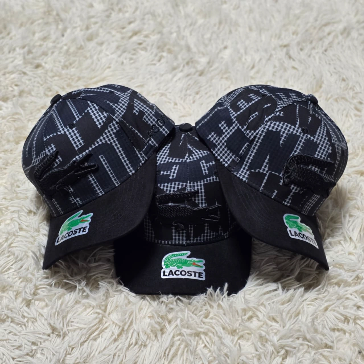 Pattern: The crown is covered in a high-contrast, all-over white "LACOSTE" signature print on a black background, creating a modern, textured aesthetic.