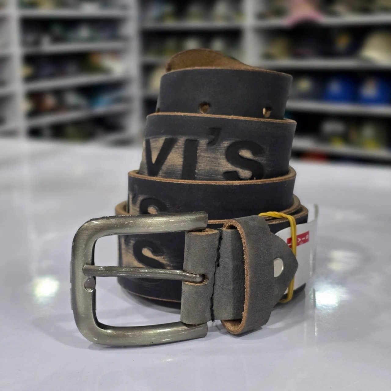 Design: The belt's standout feature is the bold "Levi's" brand name embossed directly into the leather strap. It has a rugged, vintage-inspired aesthetic.