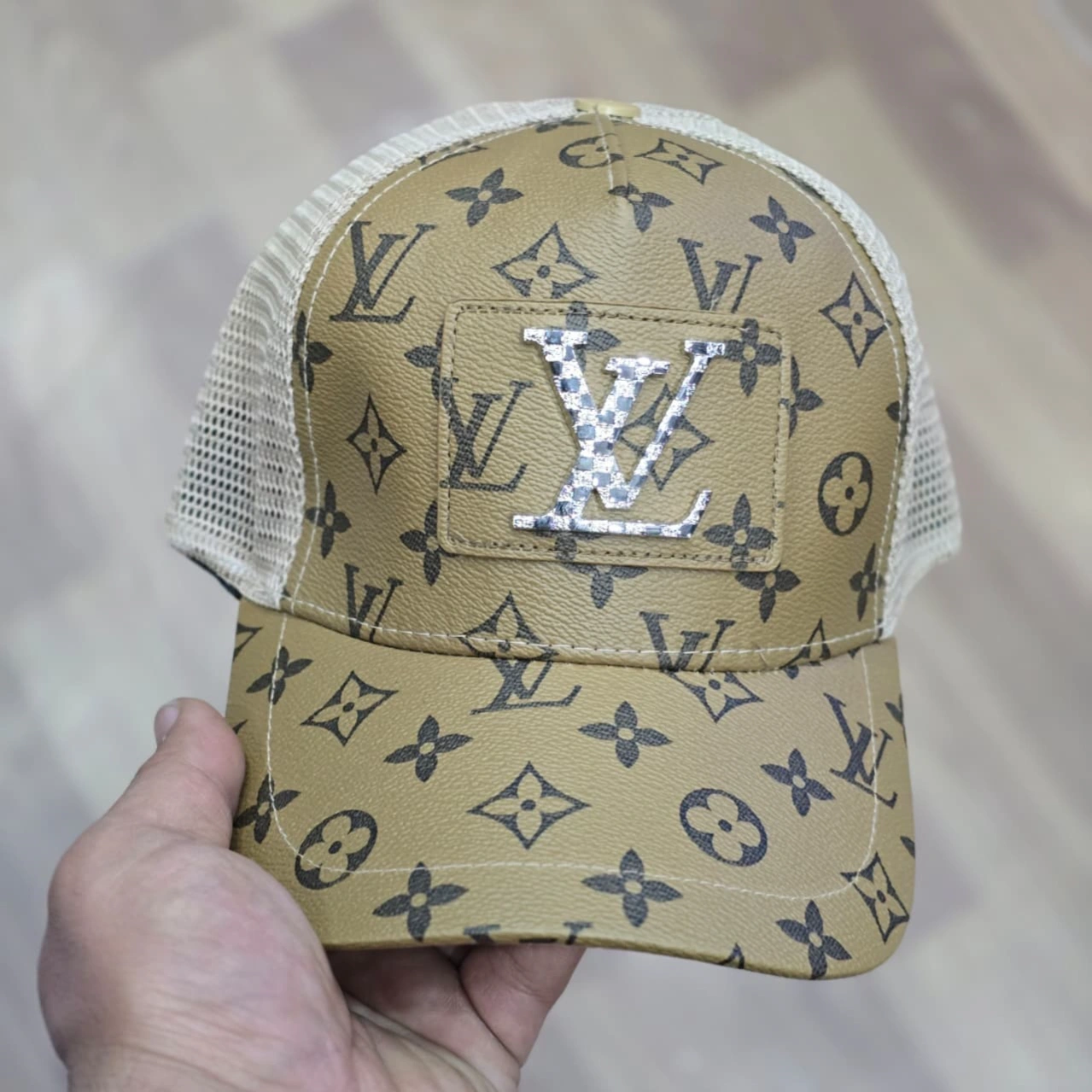 Design: A curved-visor trucker cap featuring the classic brown LV monogram across the crown and brim, paired with a beige or cream-colored mesh back for breathability.
