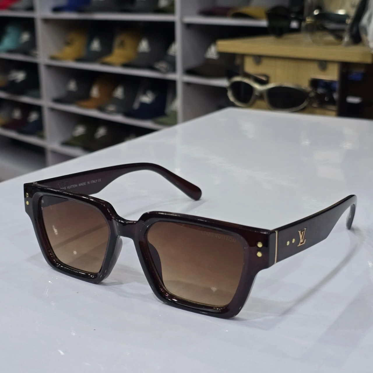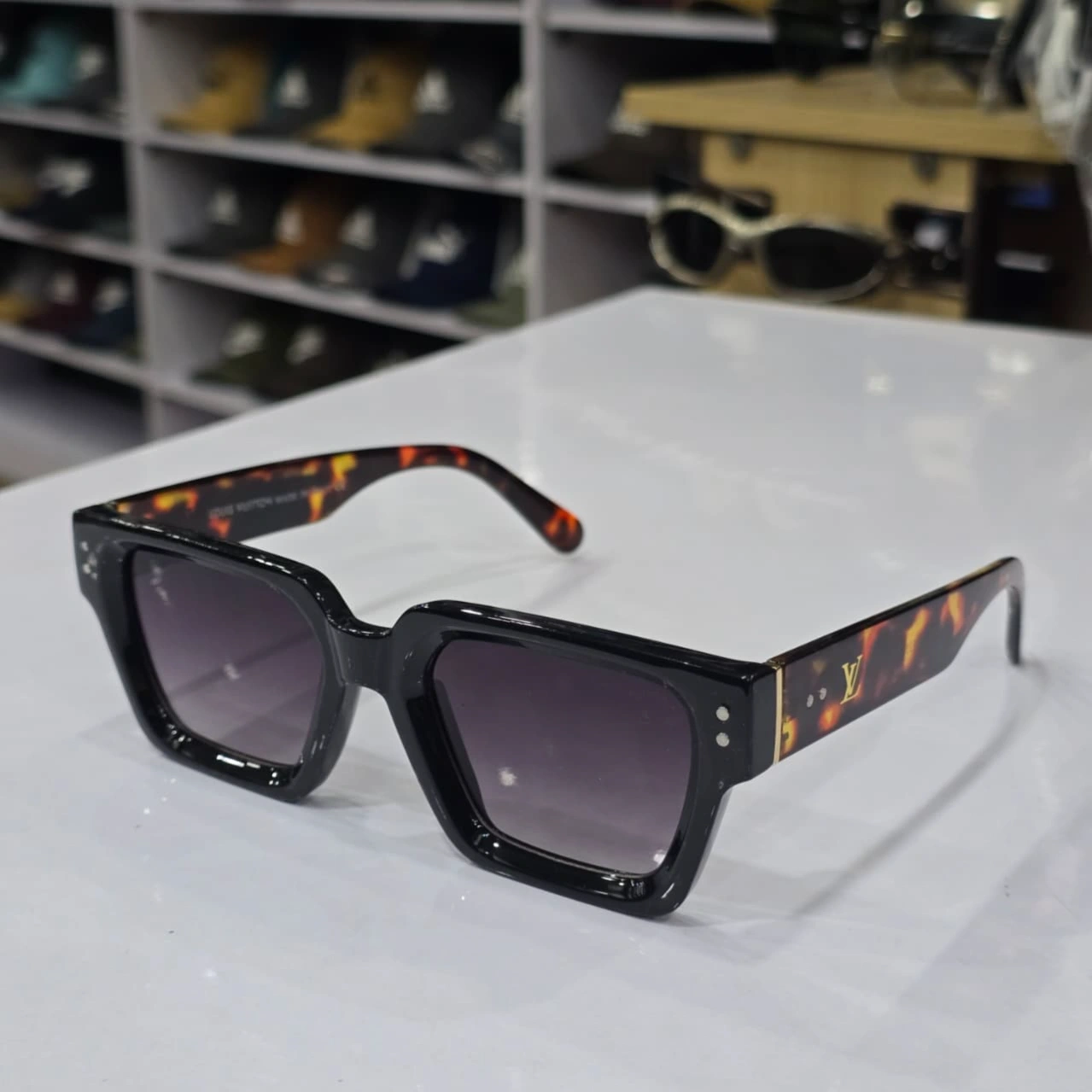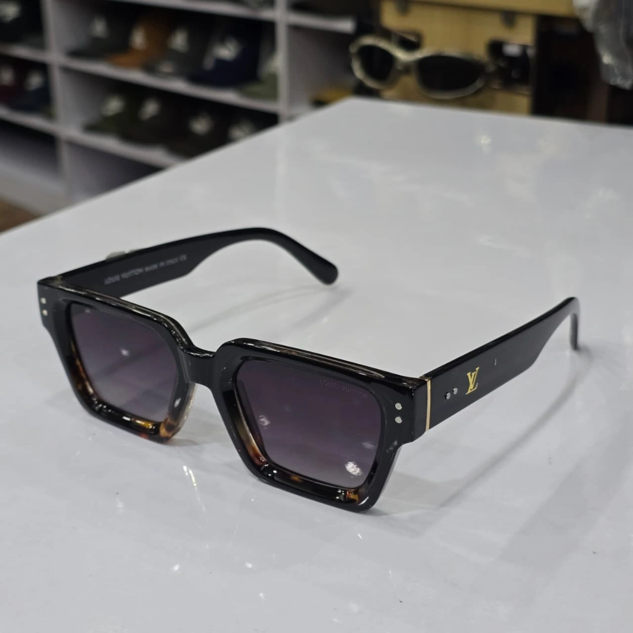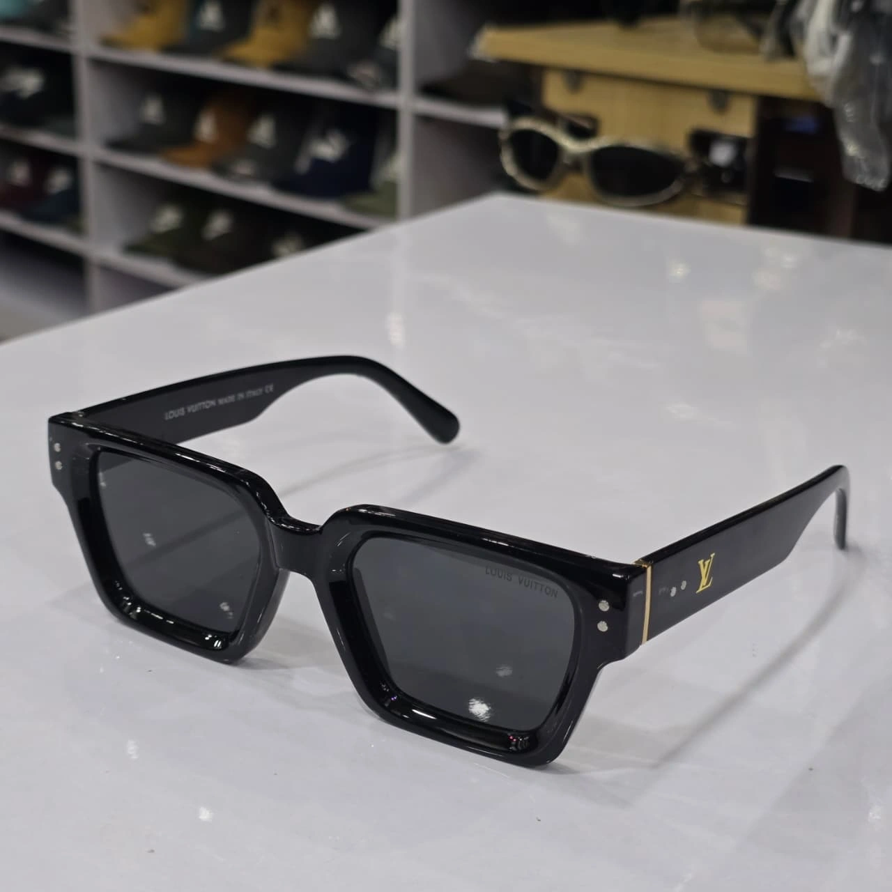 Louis Vuitton square-frame designer sunglasses. These shades are known for their bold, chunky retro-inspired aesthetic that blends luxury with a modern "hip hop" or "streetwear" style.
