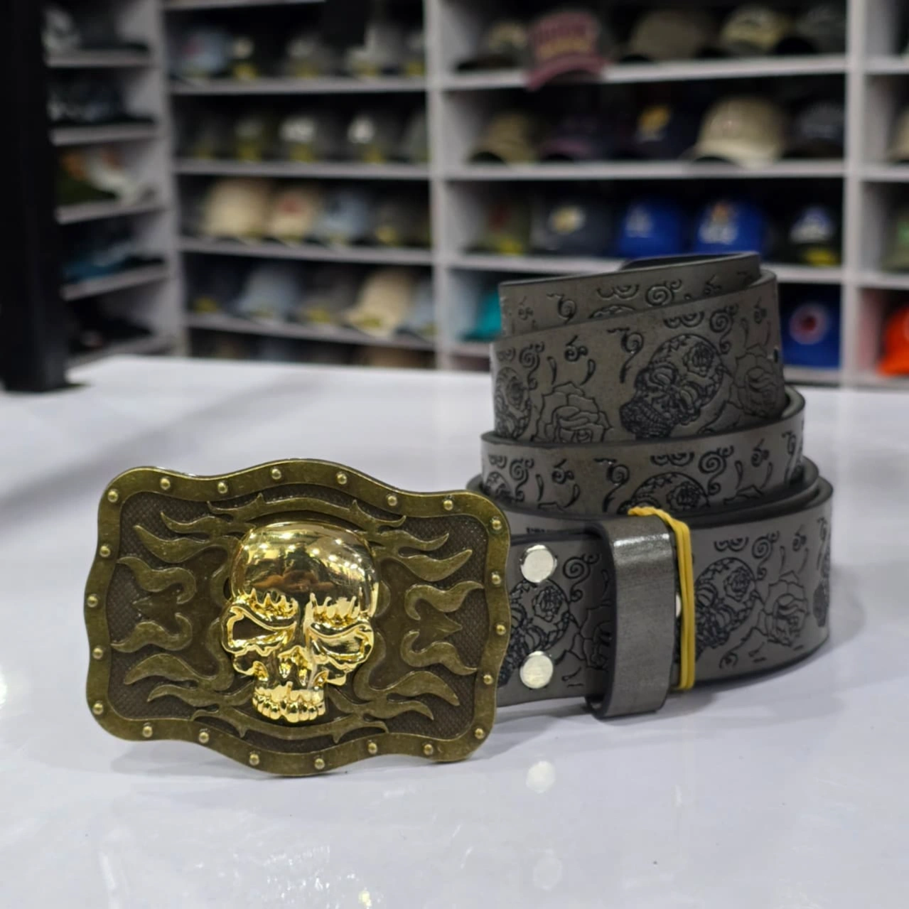 men's Western-style skull belt, a bold accessory characterized by its large ornamental buckle and patterned leather strap.