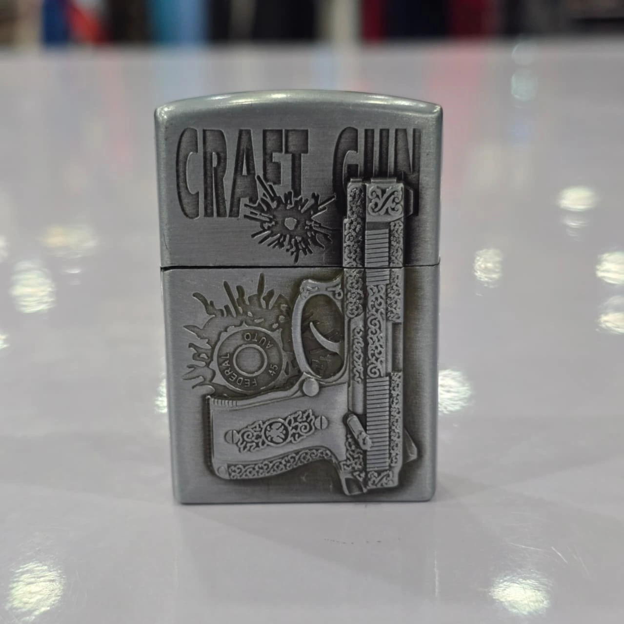 Aesthetic: The lighter has an antique silver metal finish with a prominent "CRAFT GUN" engraving on the lid. The front face features a detailed embossed semi-automatic pistol, bullet impact marks, and a ".45 Federal Auto" cartridge headstamp.