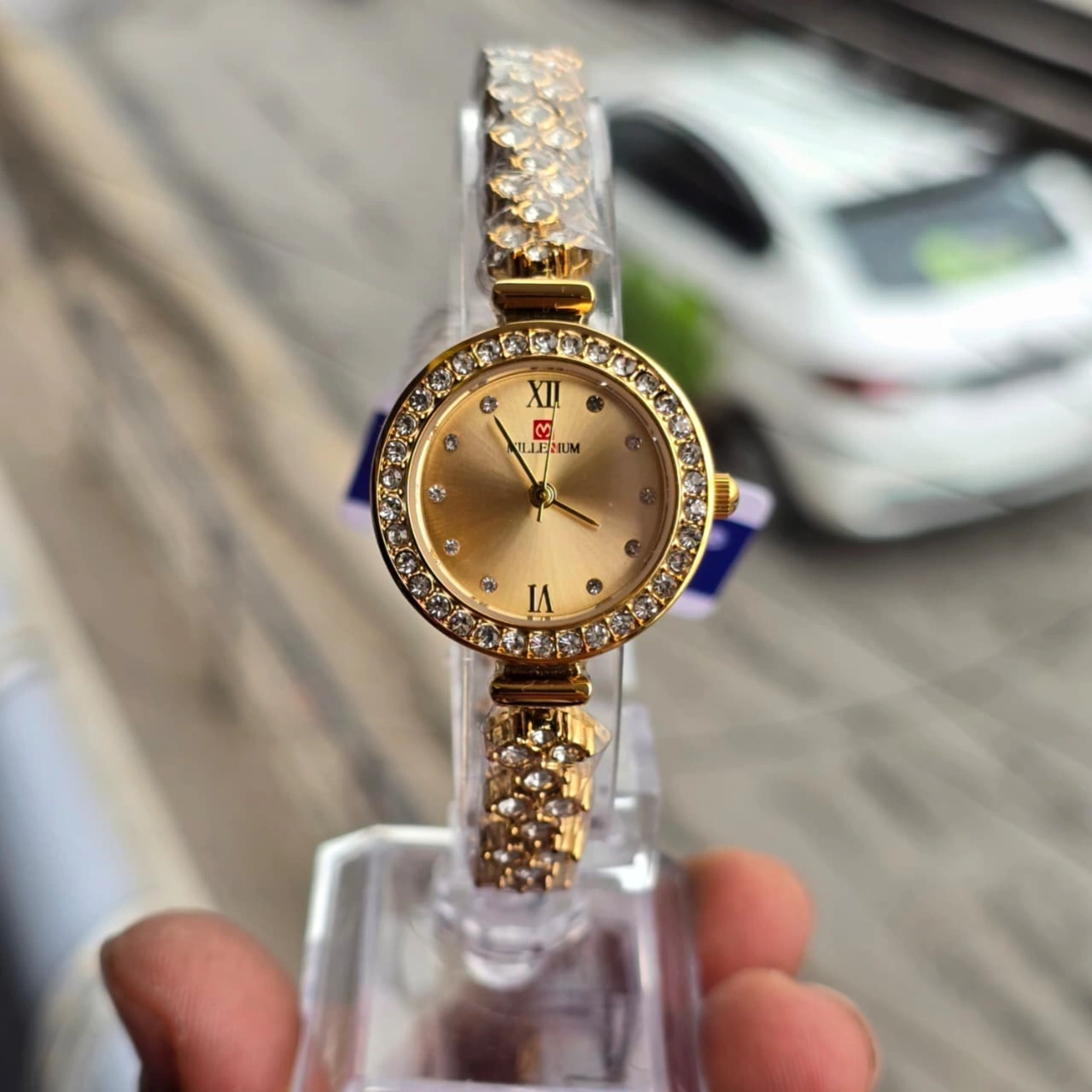 Millenium MW58435L, a classic rhinestone-surrounded bracelet design watch for women. It is an elegant timepiece that doubles as a piece of jewelry, featuring a sophisticated leaf-shaped rhinestone bracelet.