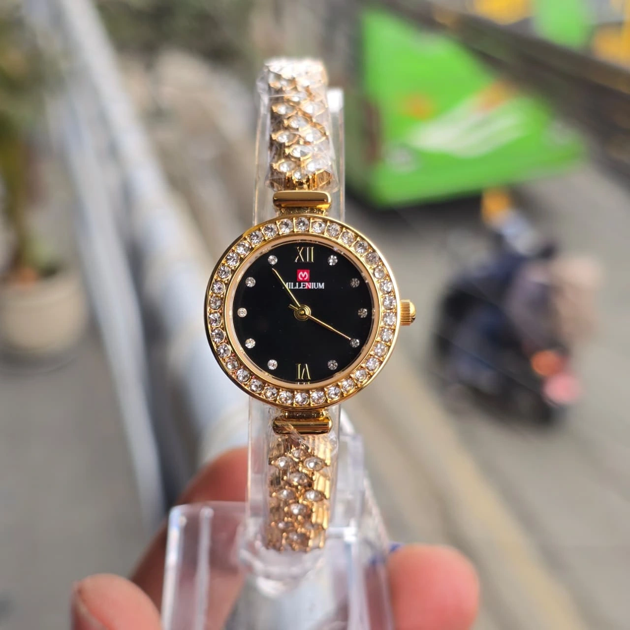 Millenium MW58435L, an elegant women's timepiece designed to resemble high-fashion jewelry. It features a classic round dial surrounded by a halo of sparkling rhinestones and a delicate gold-toned bracelet.