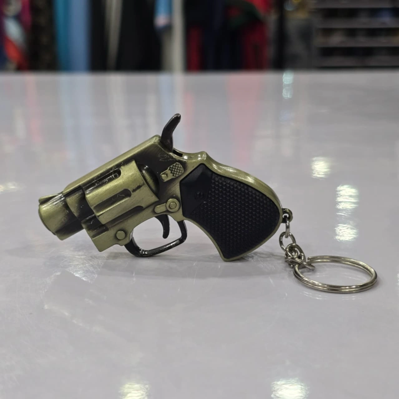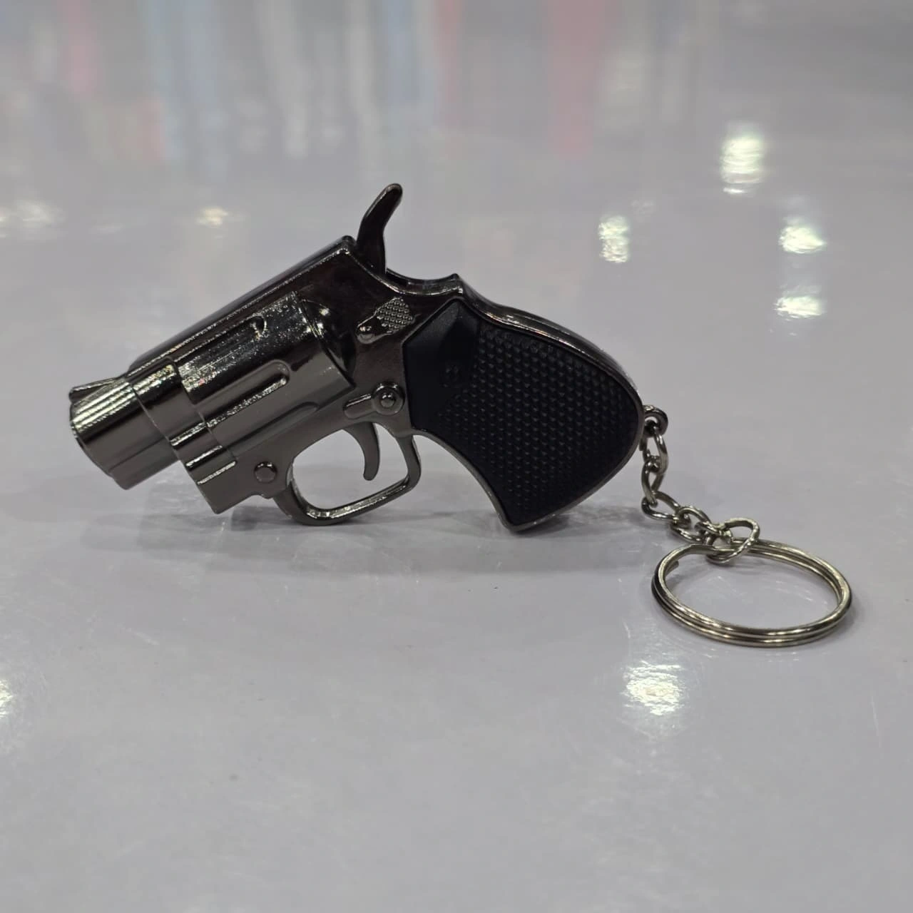 miniature revolver lighter, a creative and functional piece designed to look like a small handgun with a keychain attachment.
