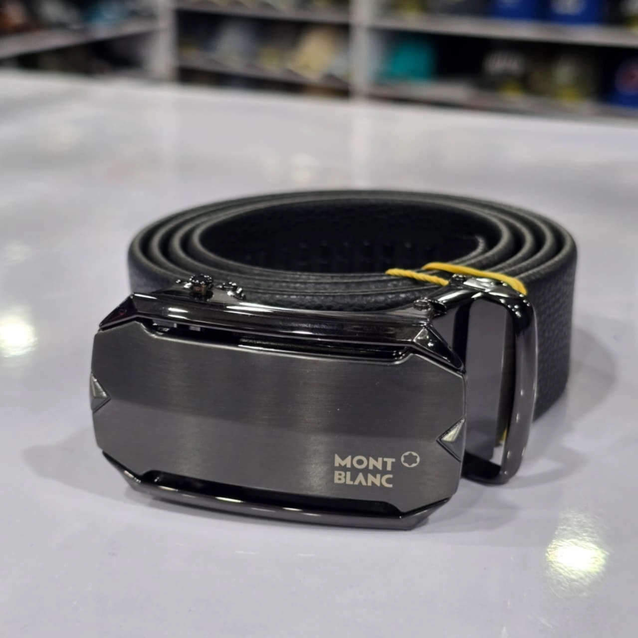 Montblanc Automatic Buckle Leather Belt, a luxury accessory known for its sleek design and micro-adjustable ratchet mechanism. It features a prominent "Oval" or "Shield" shaped buckle with a distinctive brushed gunmetal finish.