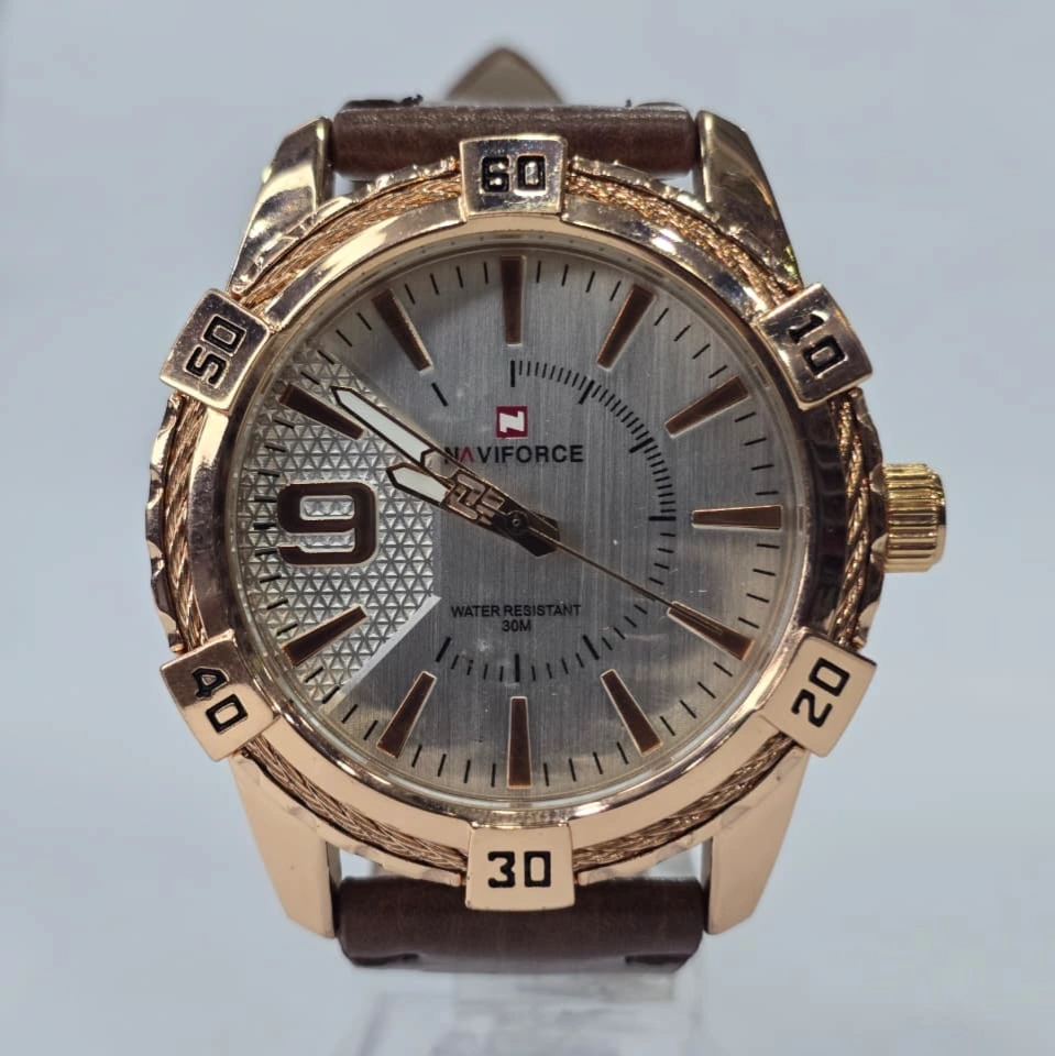 NaviForce NF9117L (specifically the Rosegold/Silver dial version with a brown leather strap). It is a men's luxury sport quartz watch known for its distinctive large face and functional design.
