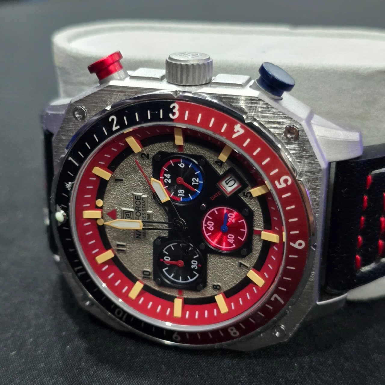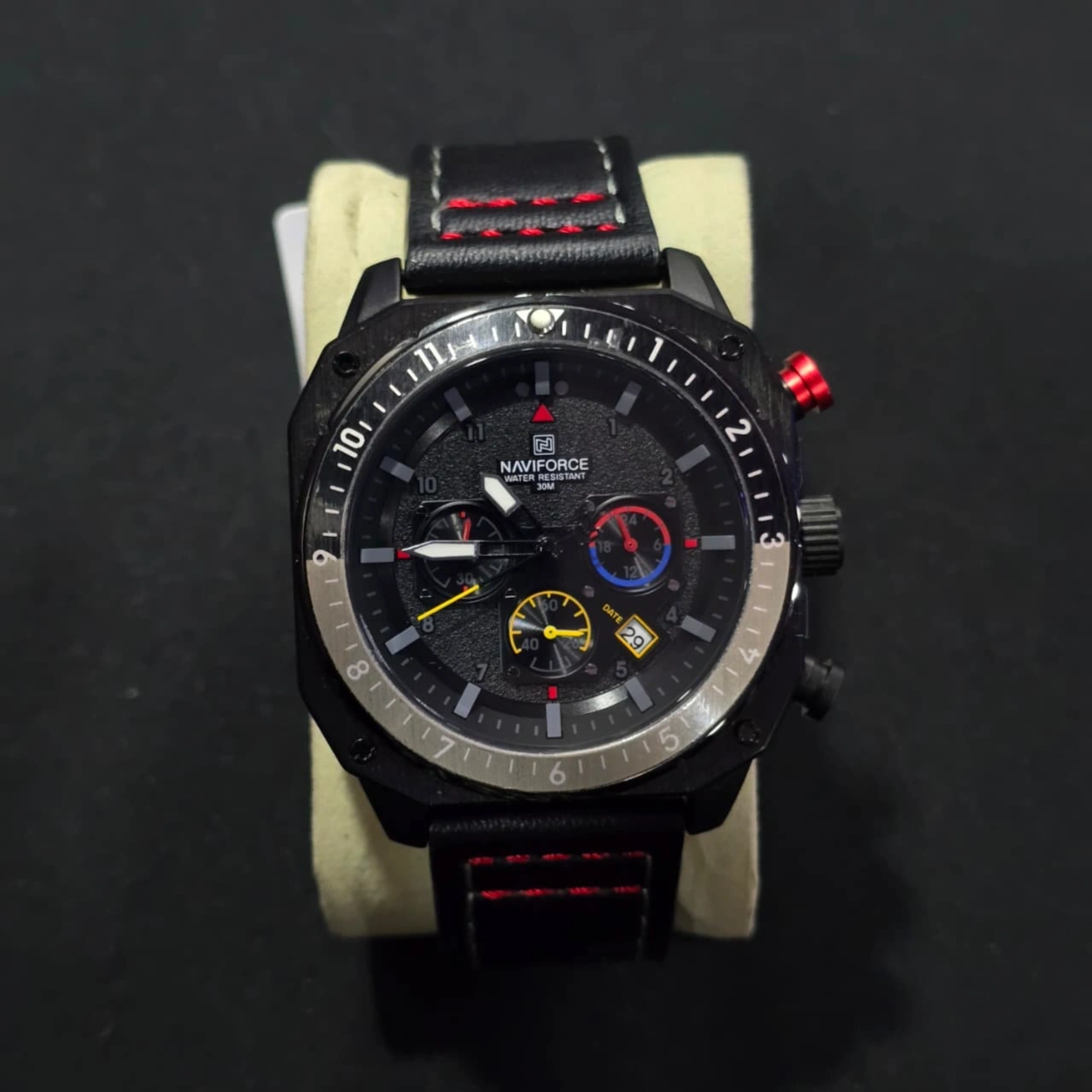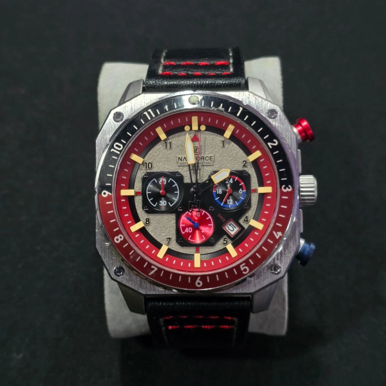 Materials: It is typically paired with a genuine leather strap featuring red contrast stitching and a hardened mineral glass dial window.