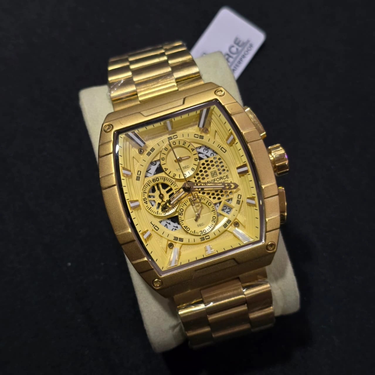 Naviforce NF8066, a bold and masculine men's chronograph featuring a distinctive tonneau (barrel-shaped) case and a fully golden aesthetic.