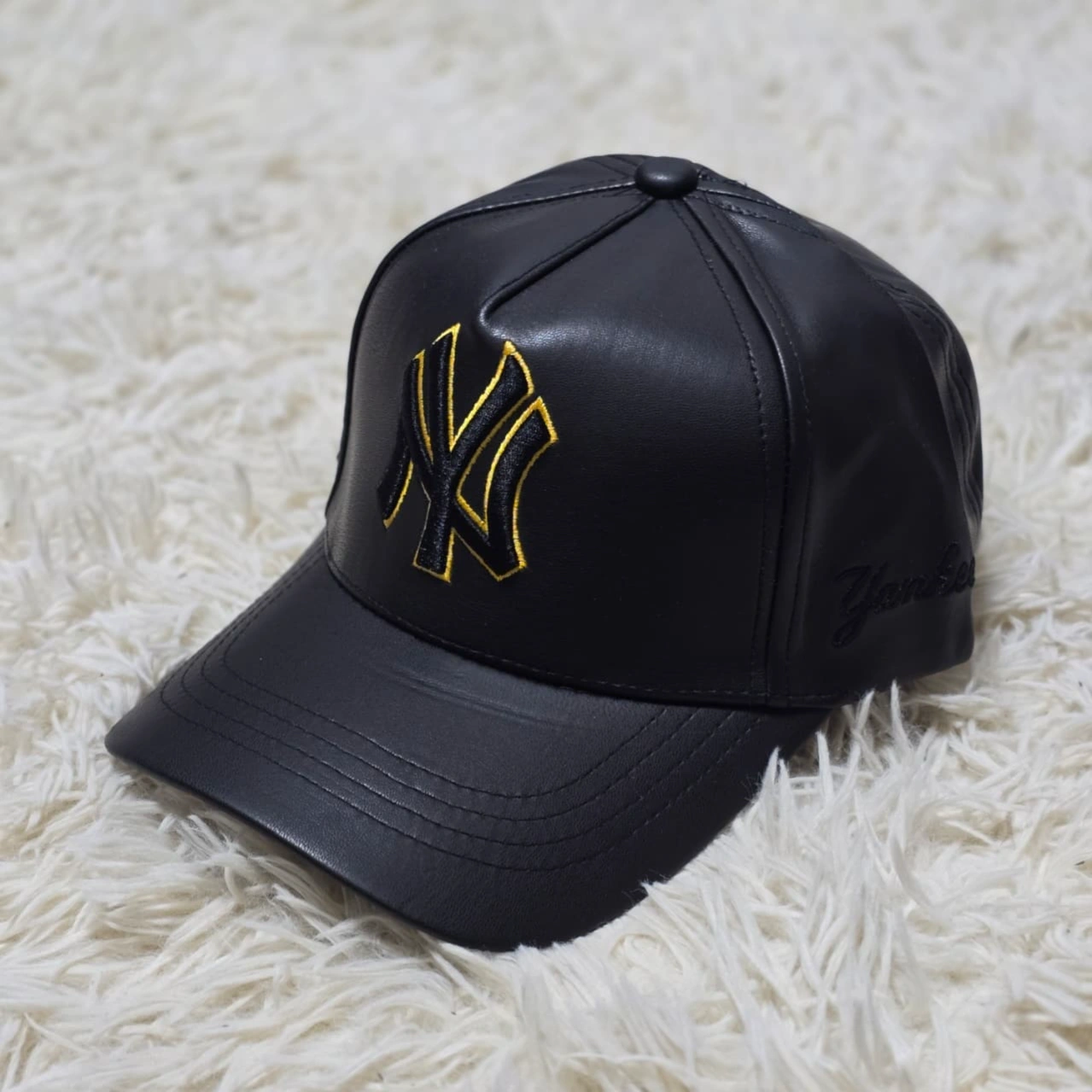 New York Yankees MLB Leather Baseball Cap in black. This premium headwear is characterized by its sleek, sophisticated look, departing from traditional fabric caps with its 100% genuine or faux leather construction.