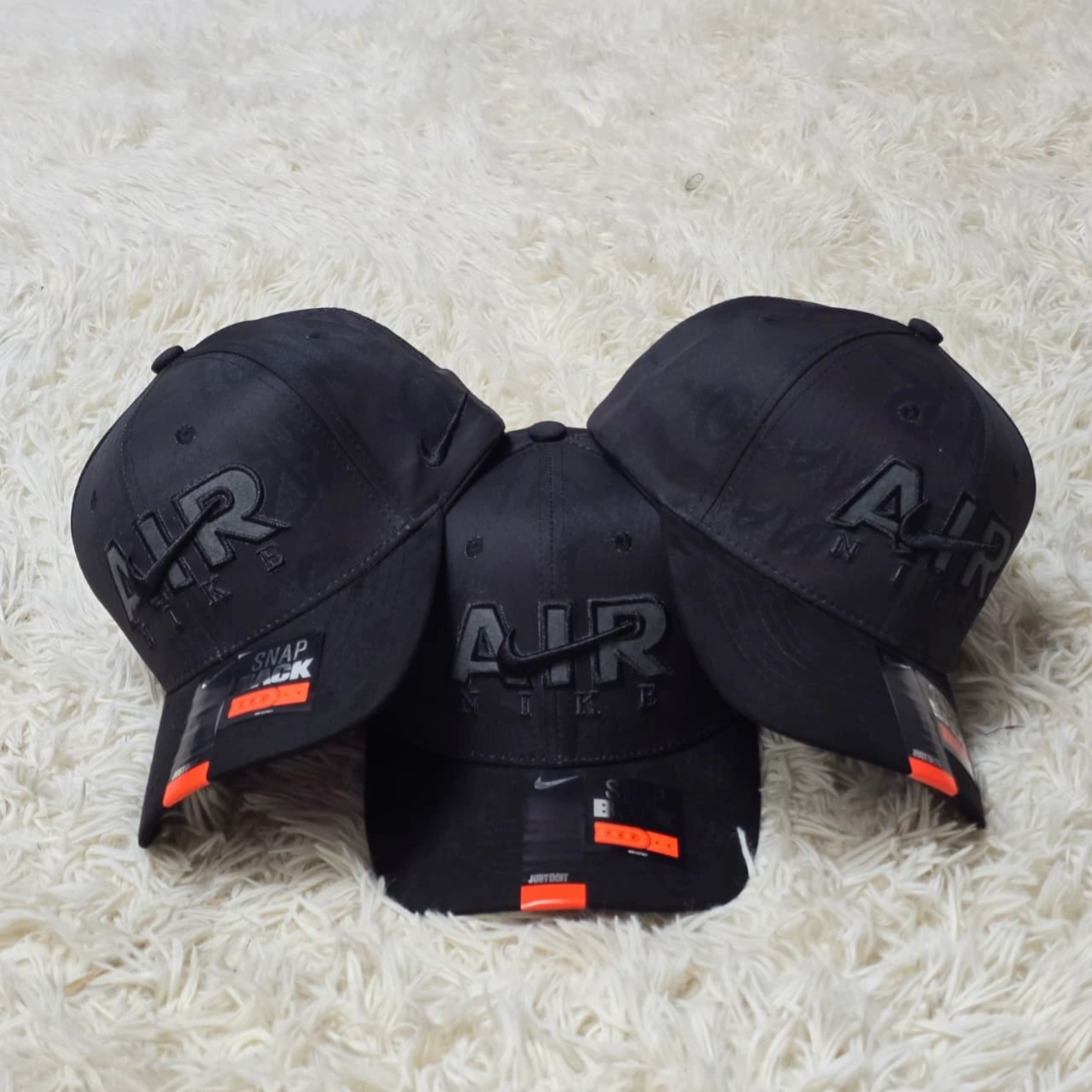 Nike Air black snapback hats featuring bold, embossed "AIR" branding across the front panels. These structured baseball caps typically feature a six-panel construction with breathable eyelets and a curved brim for a classic athletic look.