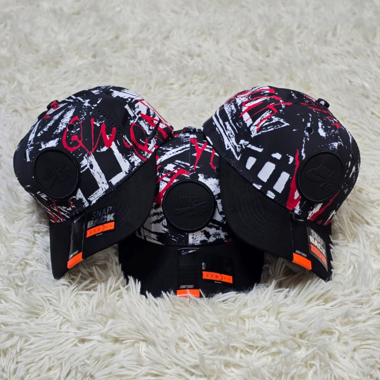 Unleash your urban style with these bold Nike caps, featuring a striking pattern.