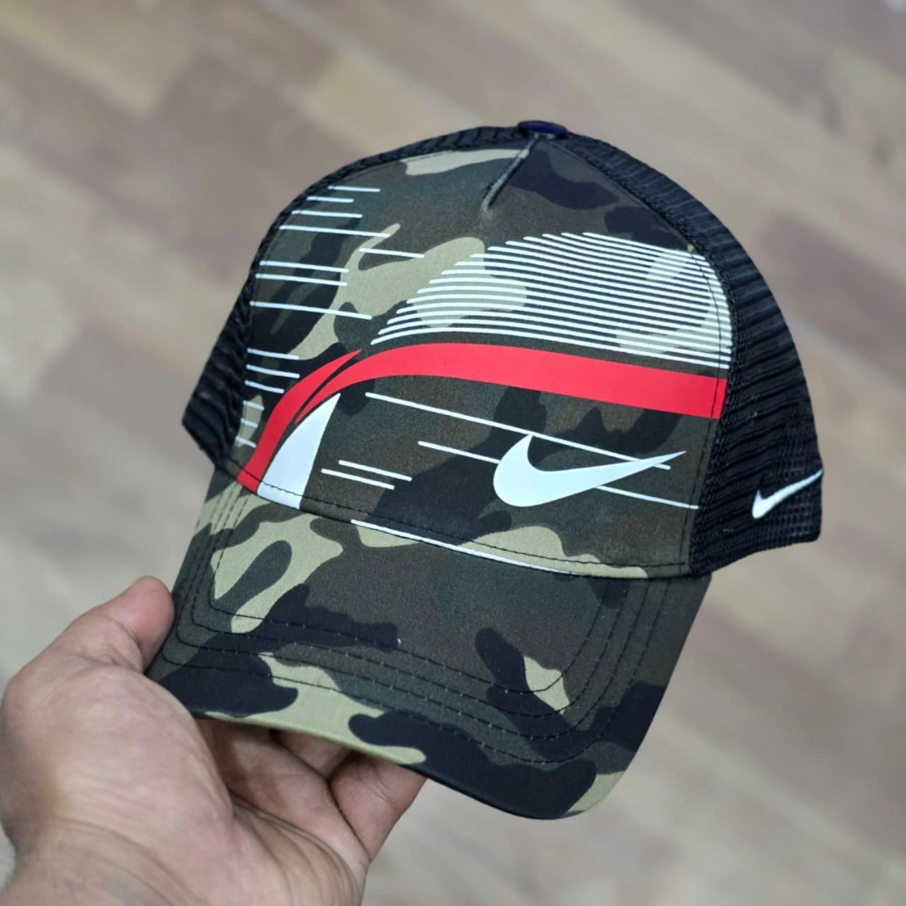 camouflage-patterned trucker cap with a mesh back and distinct graphics. This specific design, which includes white and red swooping lines along with the Nike logo, is associated with various fashion outlets and appears to be part of a "premium quality" or "triple AAA" collection from specialized cap retailers.