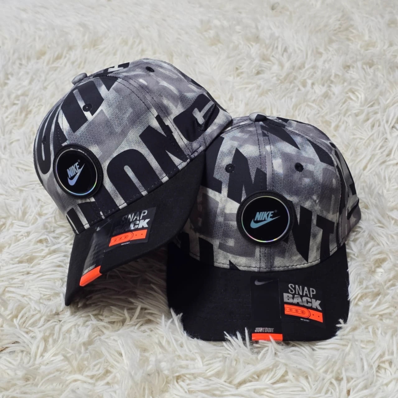 Nike black snapback caps featuring an embroidered "Swoosh" logo on the front panels. They are characterized by a 6-panel structured design and include retail "Snapback" stickers on the brims.