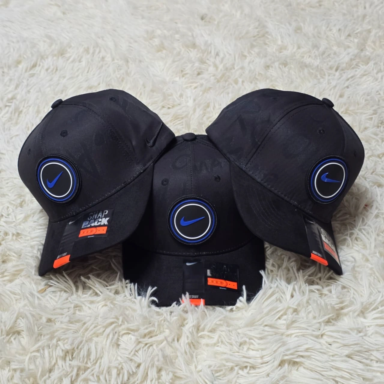 Nike black snapback caps featuring an embroidered "Swoosh" logo on the front panels. They are characterized by a 6-panel structured design and include retail "Snapback" stickers on the brims.