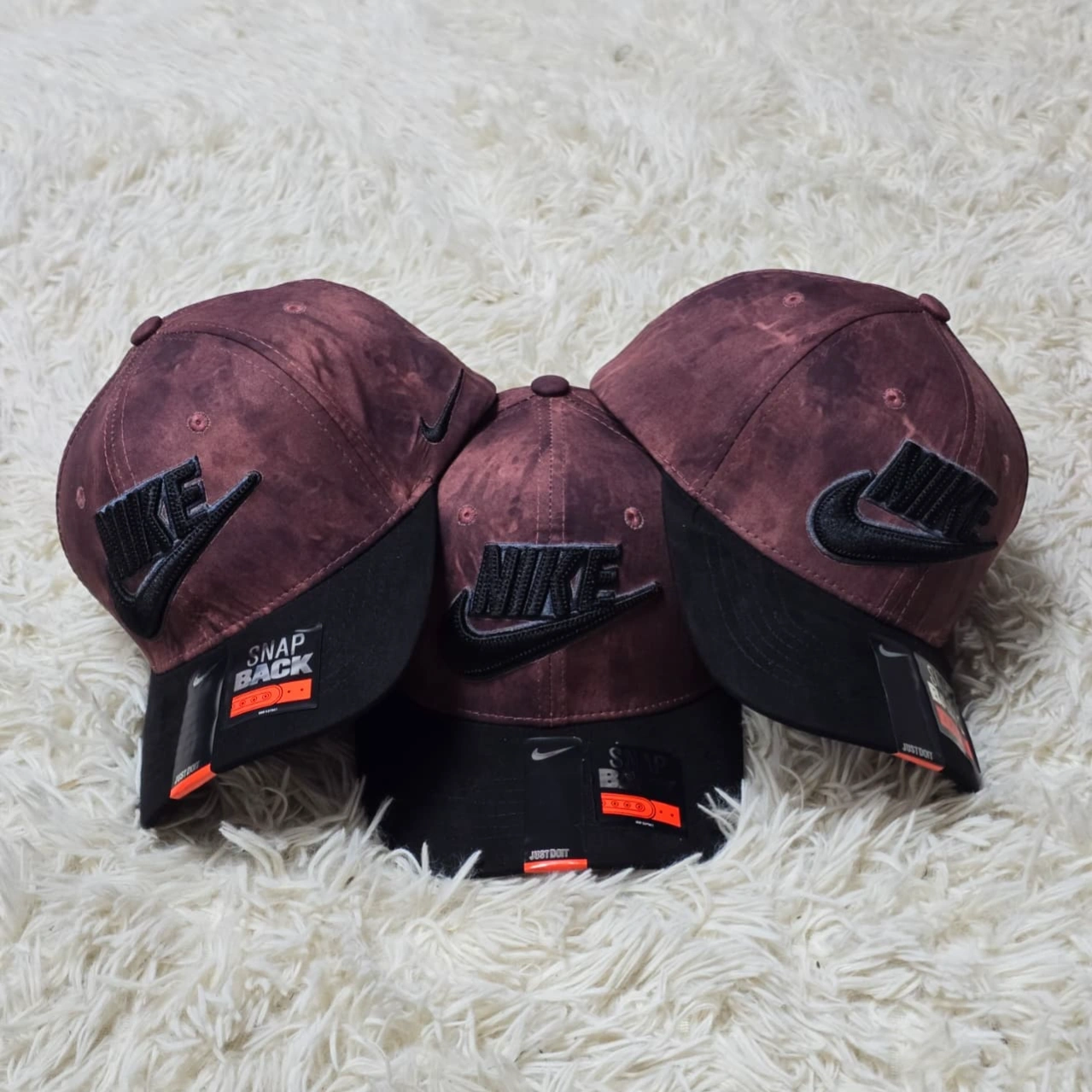 Nike snapback caps featuring an embroidered "Swoosh" logo on the front panels. They are characterized by a 6-panel structured design and include retail "Snapback" stickers on the brims.