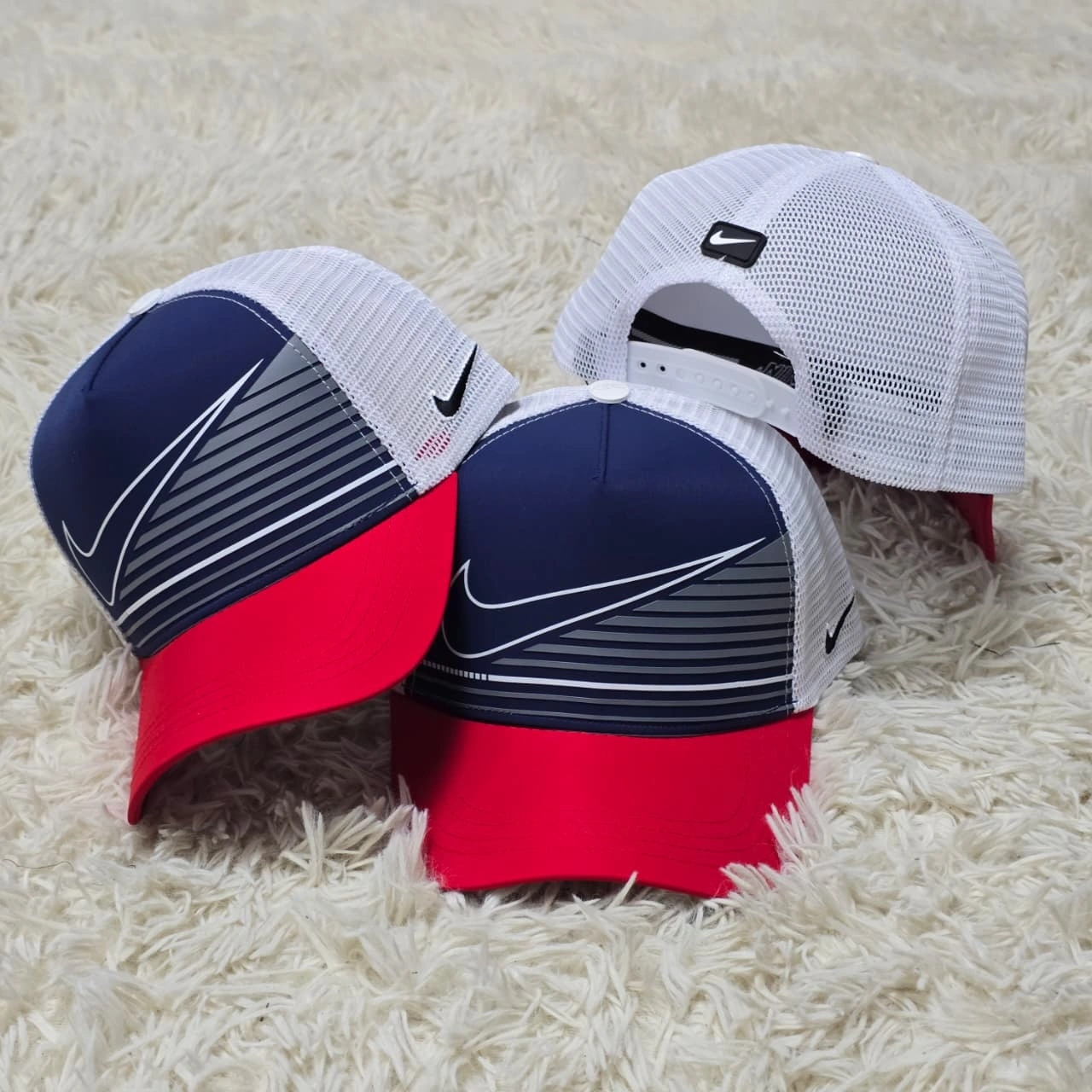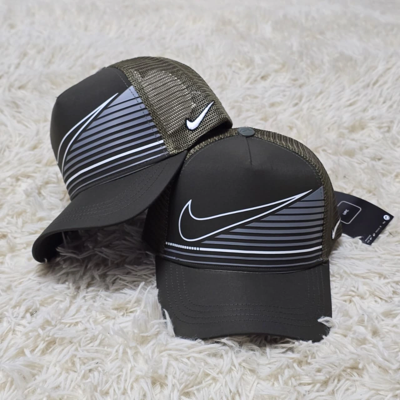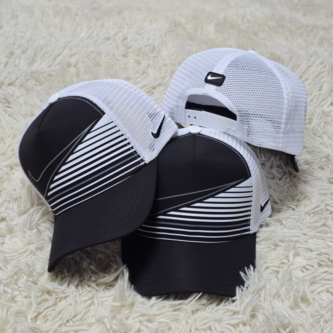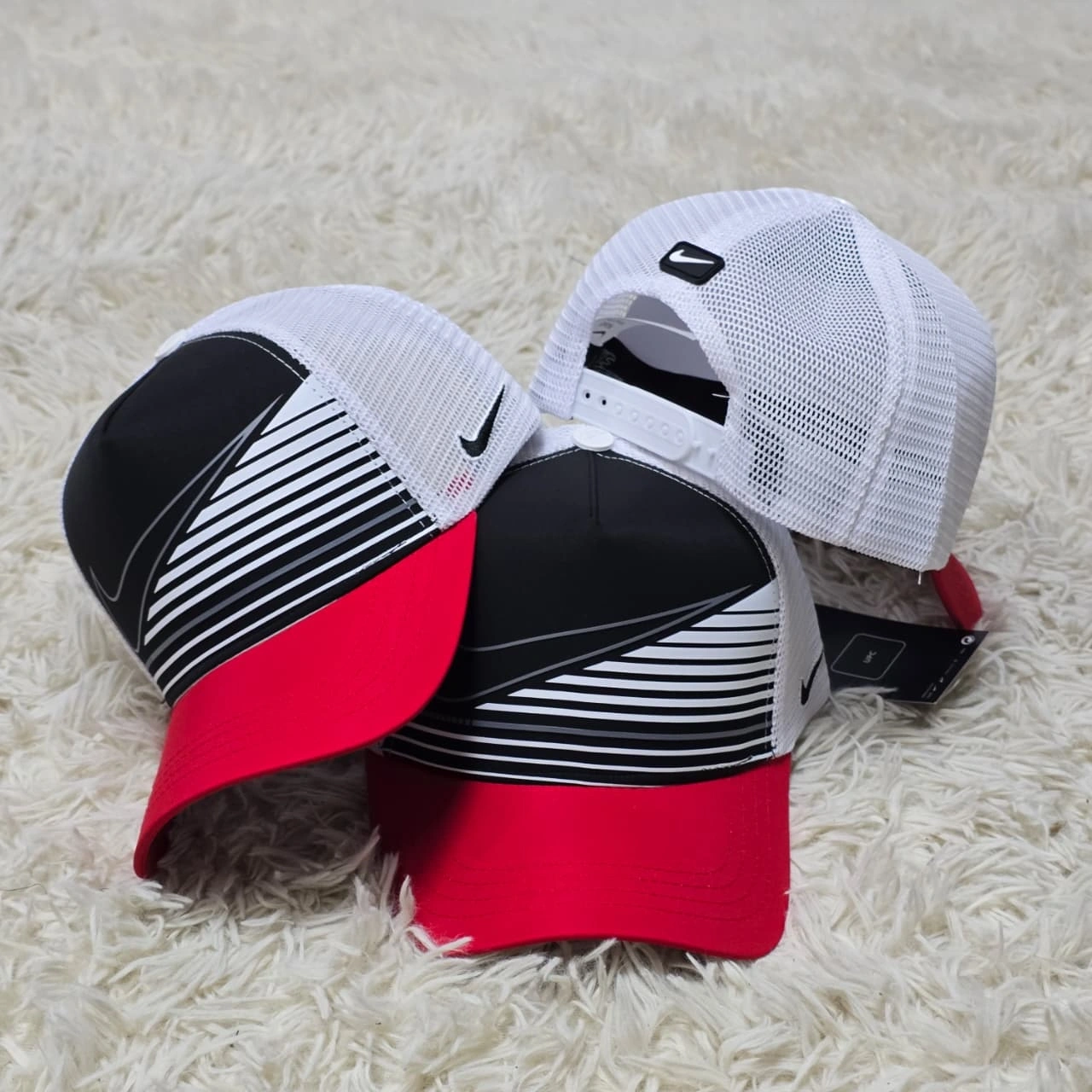 Unleash your urban style with these bold Nike caps, featuring a striking pattern.