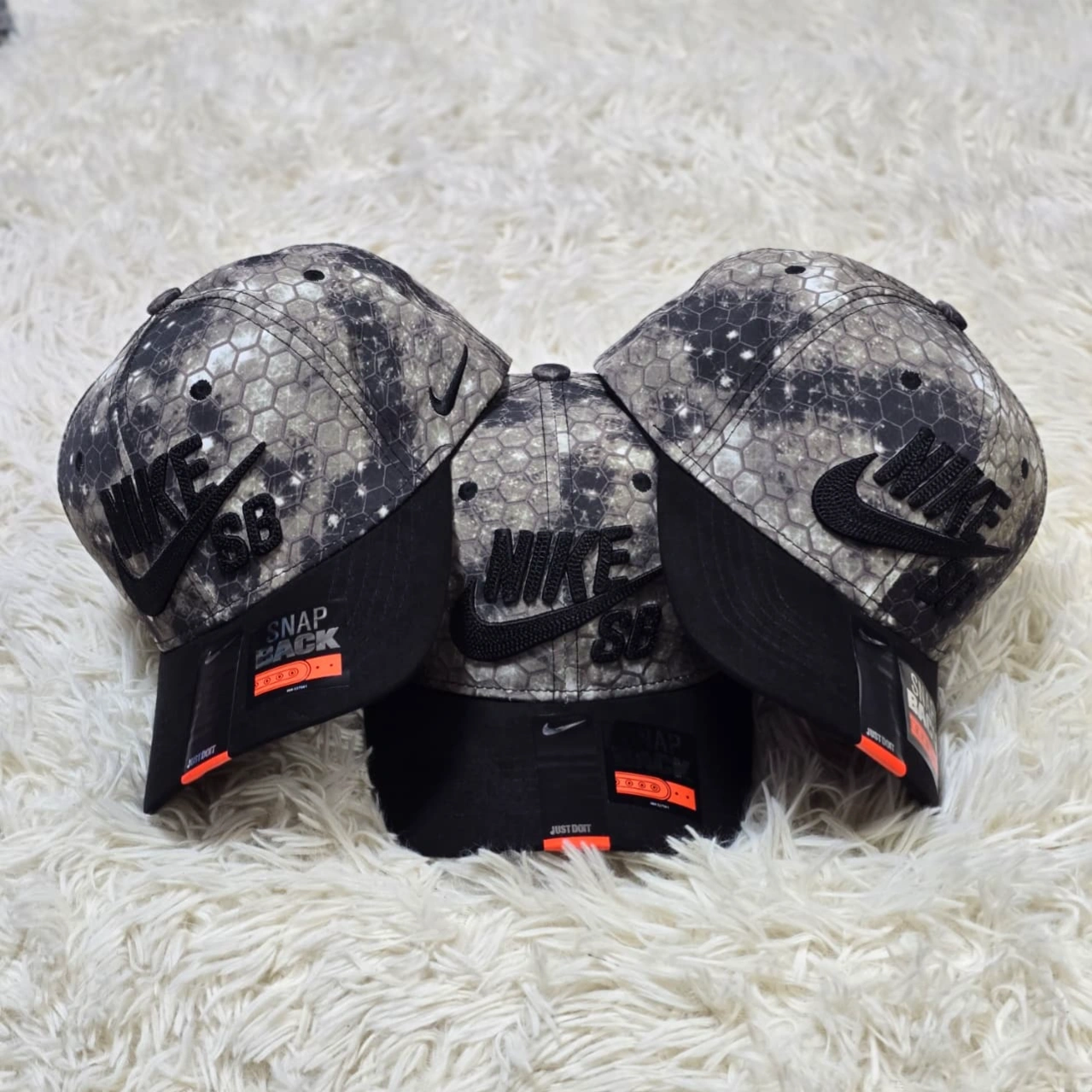 Unleash your urban style with these bold Nike caps, featuring a striking pattern.
